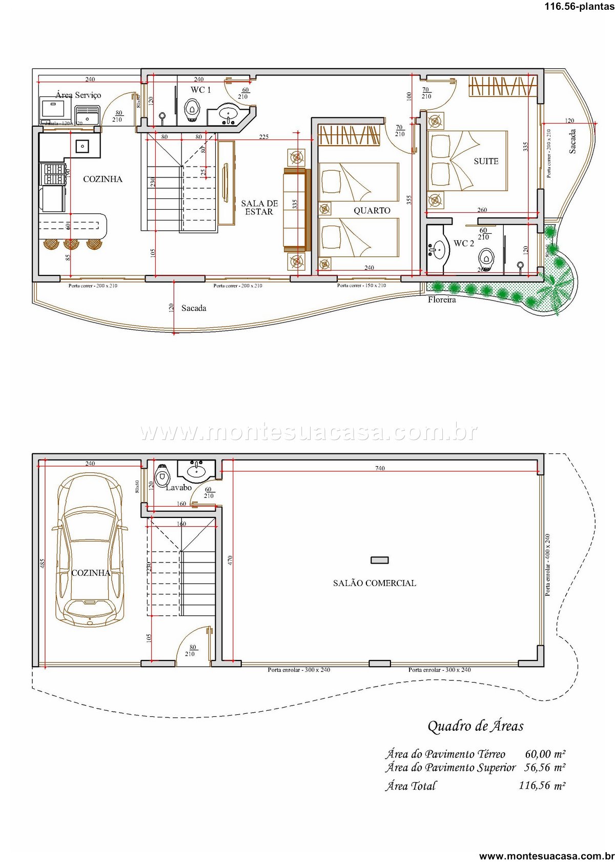 Este projeto de sobrado com 116,56m² é uma solução inteligente para quem busca unir residência e espaço comercial em um único imóvel. Com dois pavimentos bem distribuídos, ele oferece conforto para a família e funcionalidade para empreender.