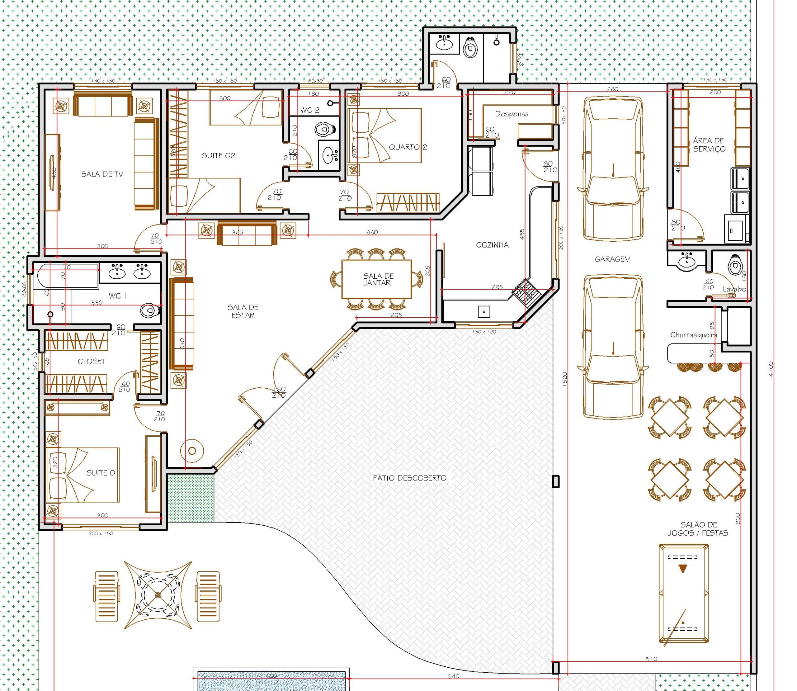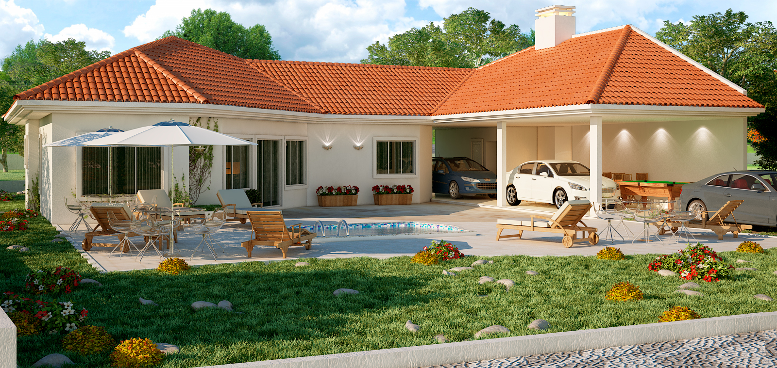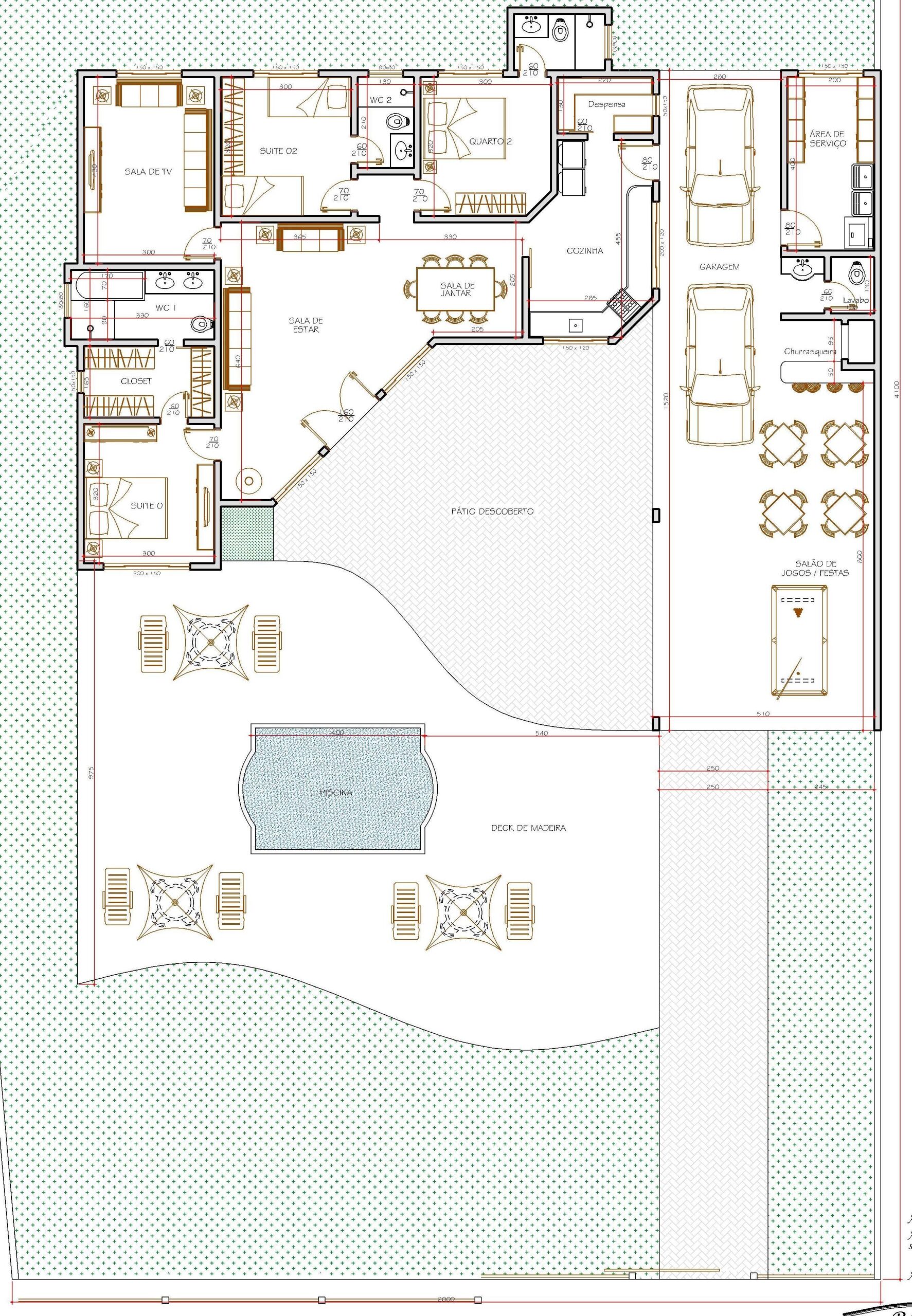 A área social é o grande destaque desta residência, integrando a Sala de TV e a Sala de Jogos / Festas em um único ambiente de entretenimento. Este espaço se conecta diretamente ao Pátio Descoberto, ampliando as possibilidades de lazer e recepção de visitas. A Cozinha, estrategicamente posicionada, mantém relação direta com a área gourmet e a churrasqueira, ideal para quem gosta de receber amigos. A Garagem coberta oferece comodidade e segurança, enquanto a área de serviço completa o programa com máxima funcionalidade. A integração entre interior e exterior valoriza todos os ambientes.