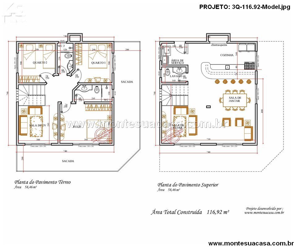 Com 116,92 m² de área construída, este projeto de sobrado foi desenvolvido para oferecer conforto, praticidade e elegância em cada detalhe. O pavimento superior abriga três quartos bem distribuídos, sendo uma suíte espaçosa com sacada privativa e dois dormitórios confortáveis que compartilham um banheiro social. A área íntima ainda conta com uma agradável sala de TV, perfeita para momentos de descanso e lazer em família.
