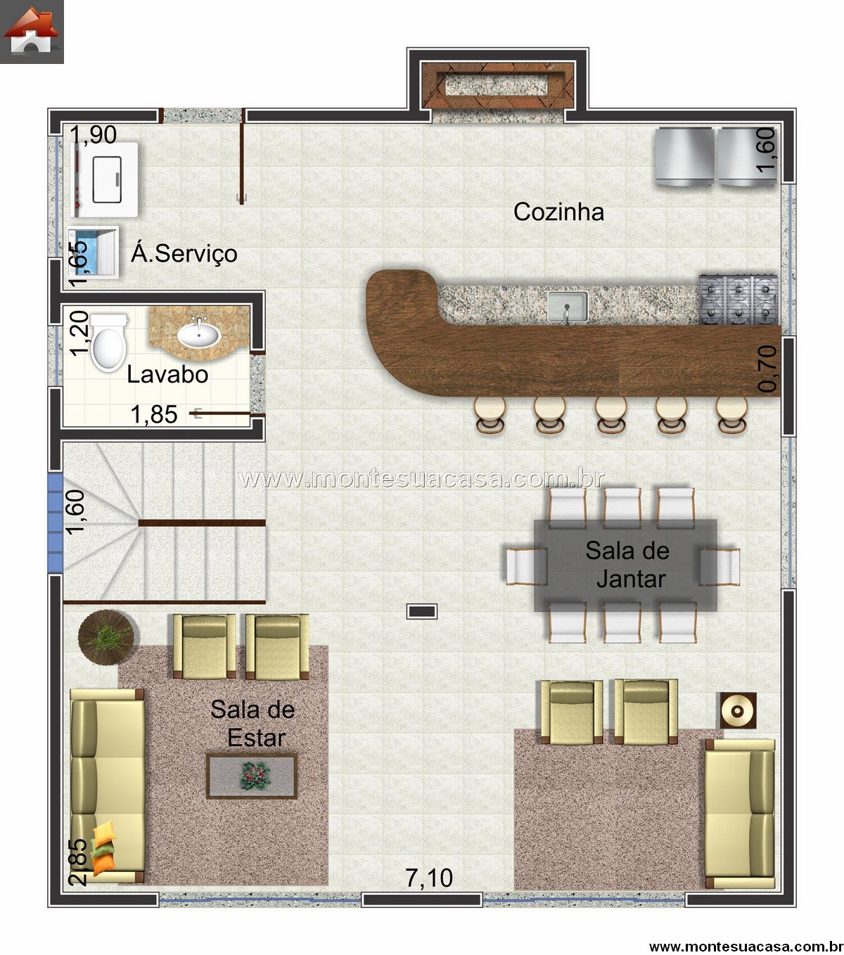 A área de serviço, estrategicamente posicionada próxima à cozinha, garante funcionalidade ao dia a dia, enquanto o lavabo próximo à escada oferece praticidade para as visitas. A sala de estar é ampla e bem iluminada, com disposição ideal para um sofá grande e poltronas, permitindo uma decoração moderna e acolhedora.