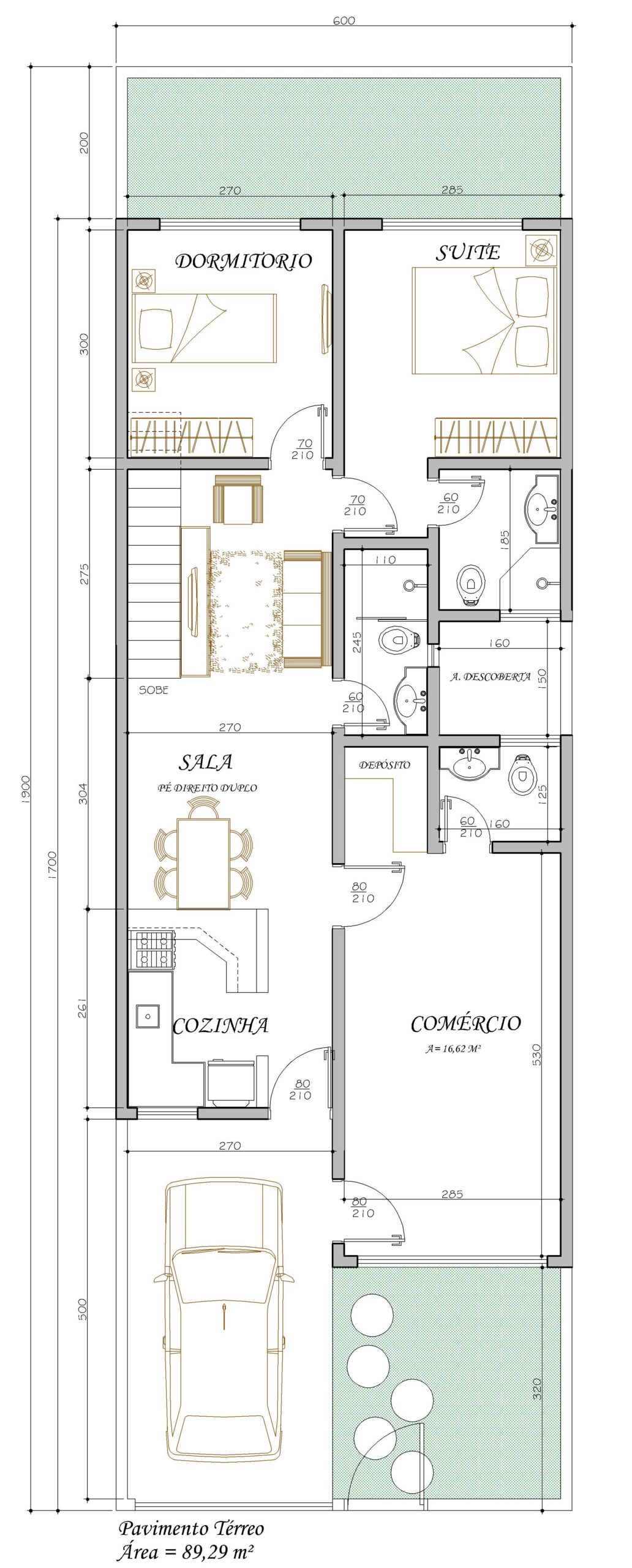 Sobrado com três quartos e espaço comercial No pavimento térreo, o destaque é a área comercial de 16,62m², posicionada estrategicamente na fachada com vitrine e espaço para logo. Essa configuração permite o funcionamento de um pequeno negócio sem interferir na rotina residencial. Ao lado, há uma garagem para um veículo e um depósito compacto.