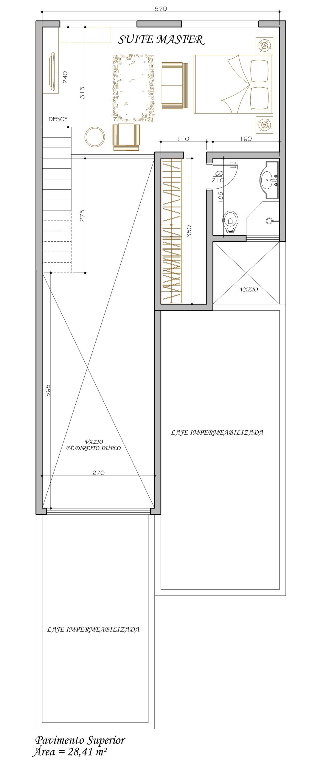 Suíte master no pavimento superior O andar superior abriga a suíte master, com closet e banheiro privativo. O ambiente é espaçoso, bem iluminado e oferece vista para o vazio do pé-direito duplo da sala. Ao lado, uma laje impermeabilizada pode ser aproveitada como terraço técnico ou área de manutenção.