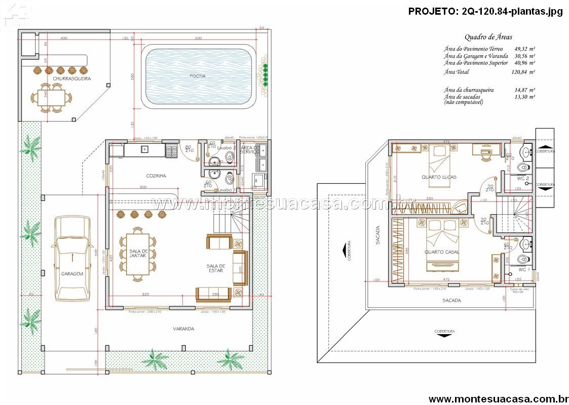 Projeto de Sobrado Moderno com 2 Quartos, Piscina e Churrasqueira – 120,84 m²