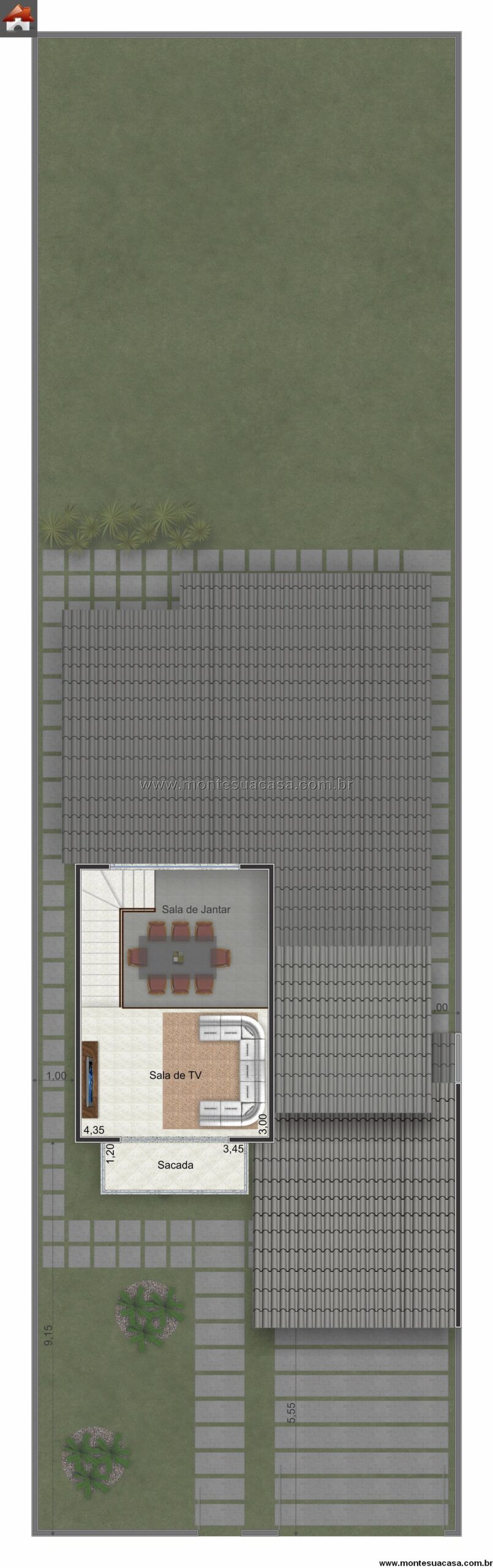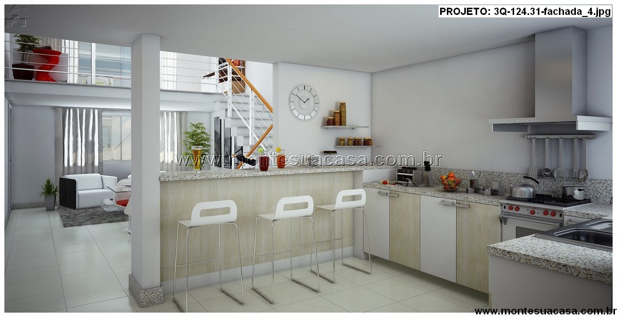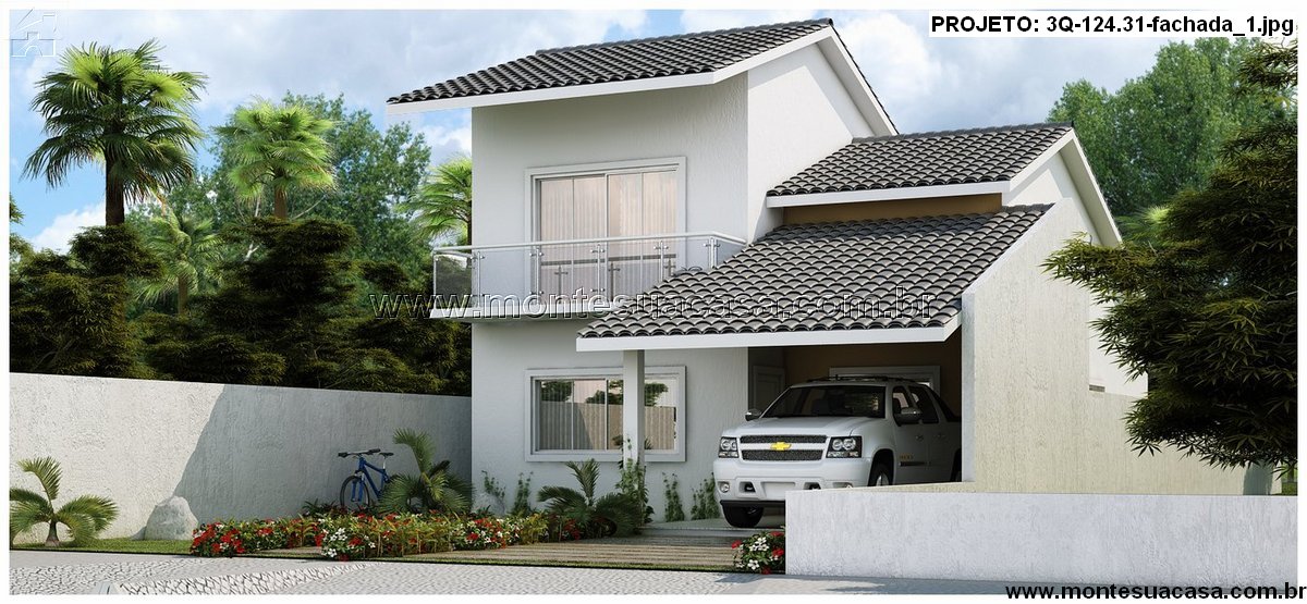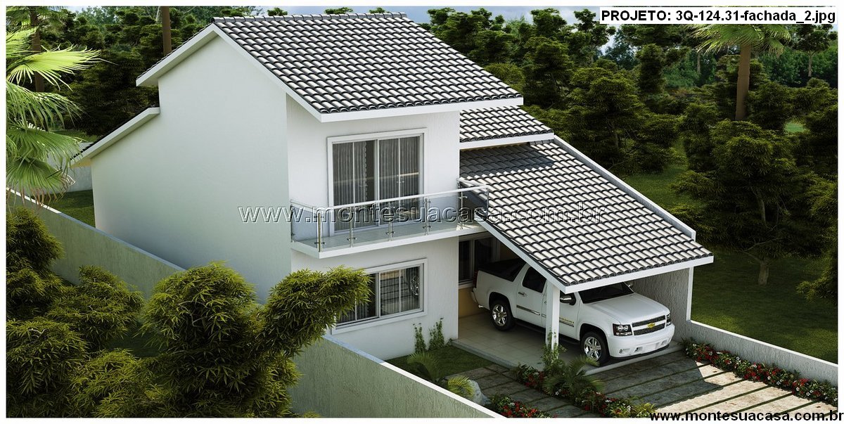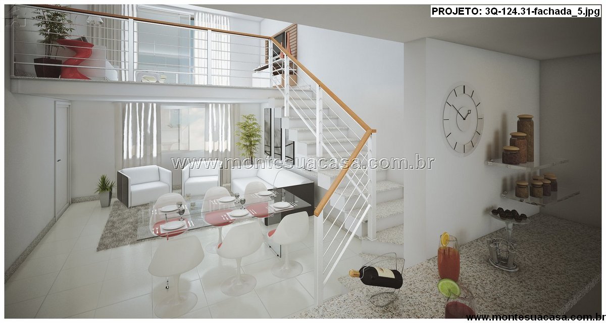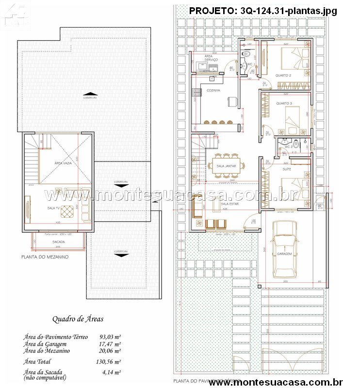 O projeto 3Q-124.31 apresenta um sobrado elegante e funcional, com 130,56 m² de área total construída, distribuídos em dois pavimentos. O destaque deste modelo é o mezanino com sala de TV e sacada, que garante amplitude visual e ventilação cruzada aos espaços sociais.