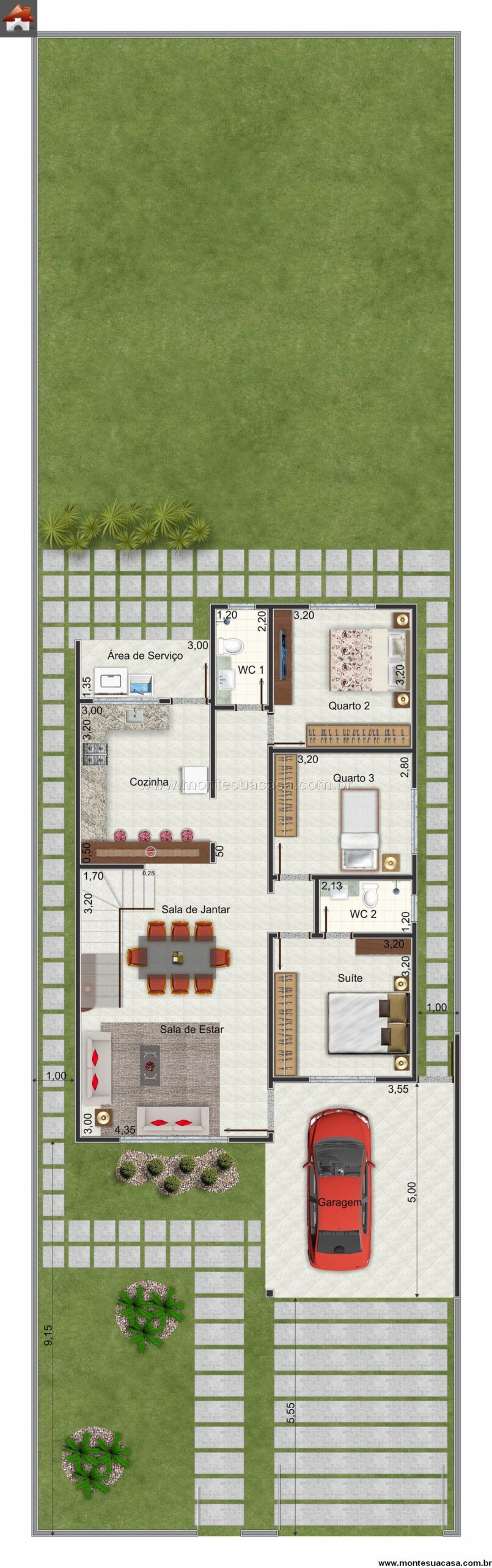 Há ainda uma área de serviço prática e ventilada, além de três dormitórios bem distribuídos — sendo um deles suíte com closet e banheiro privativo.