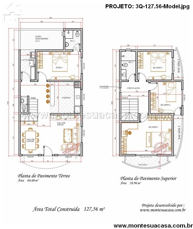 Com sua área total de 127,56 m², este projeto é perfeito para famílias que desejam um lar espaçoso e aconchegante. O design inteligente e o estilo contemporâneo fazem deste sobrado uma excelente opção para quem busca beleza, conforto e valorização do imóvel.