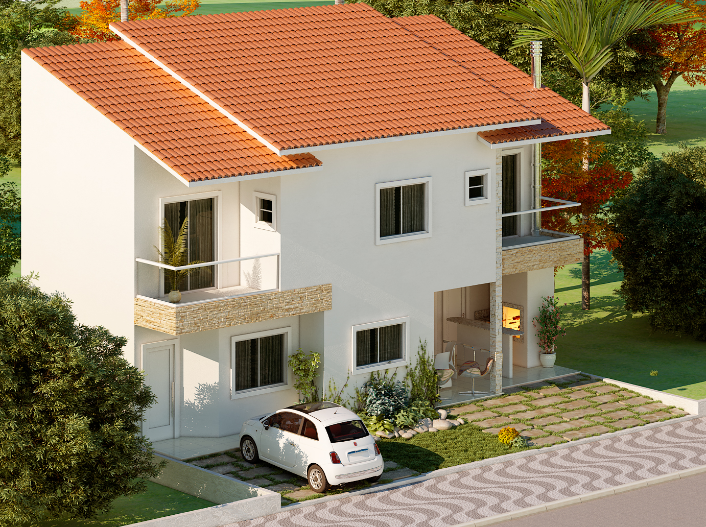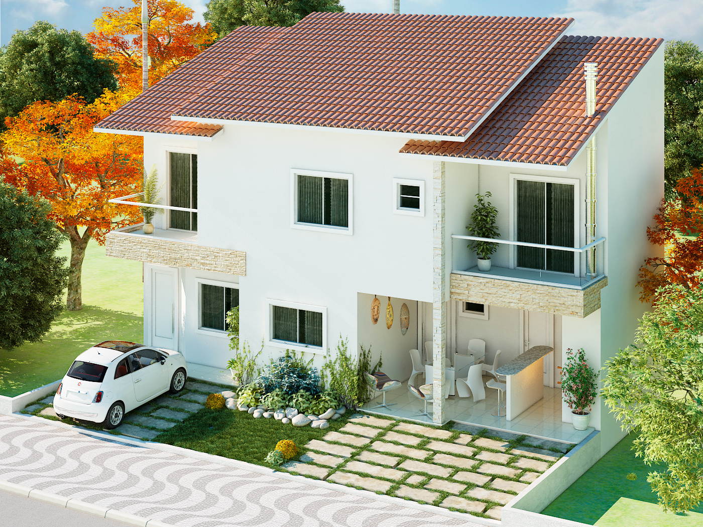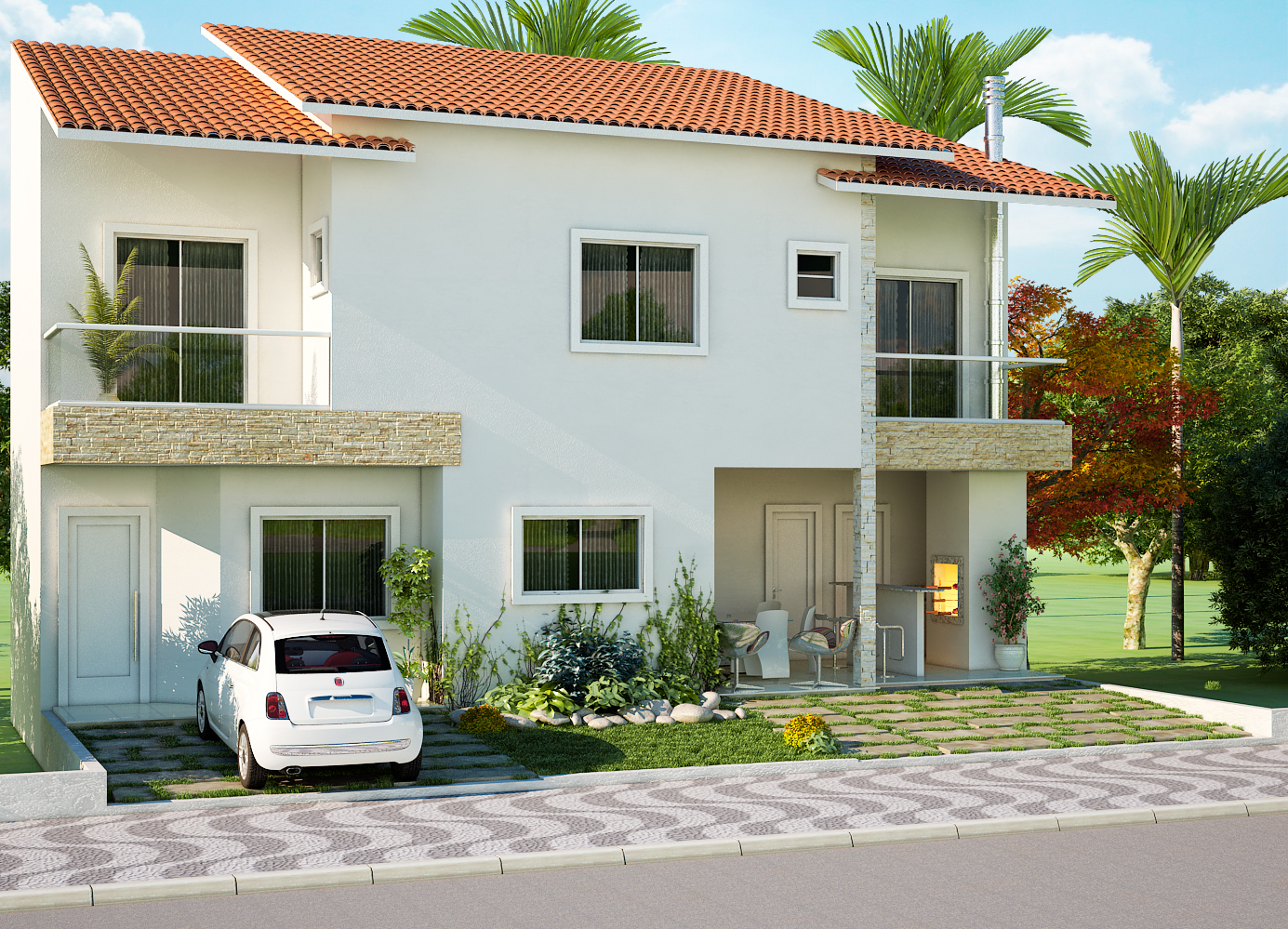 A fachada se destaca pelo telhado de duas águas com telhas cerâmicas vermelhas, que contrastam com as paredes brancas e os detalhes em pedra natural. Cada unidade possui sacadas com guarda-corpo em vidro, proporcionando leveza e amplitude visual. O paisagismo frontal inclui arbustos, pedras decorativas e caminhos em pedra, criando uma recepção acolhedora e sofisticada.