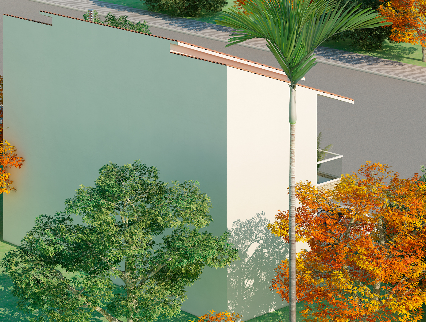 Com elementos tropicais como palmeiras e árvores de folhas coloridas, o projeto se adapta perfeitamente a regiões de clima quente. A combinação entre arquitetura limpa e natureza cria um ambiente harmonioso e convidativo.