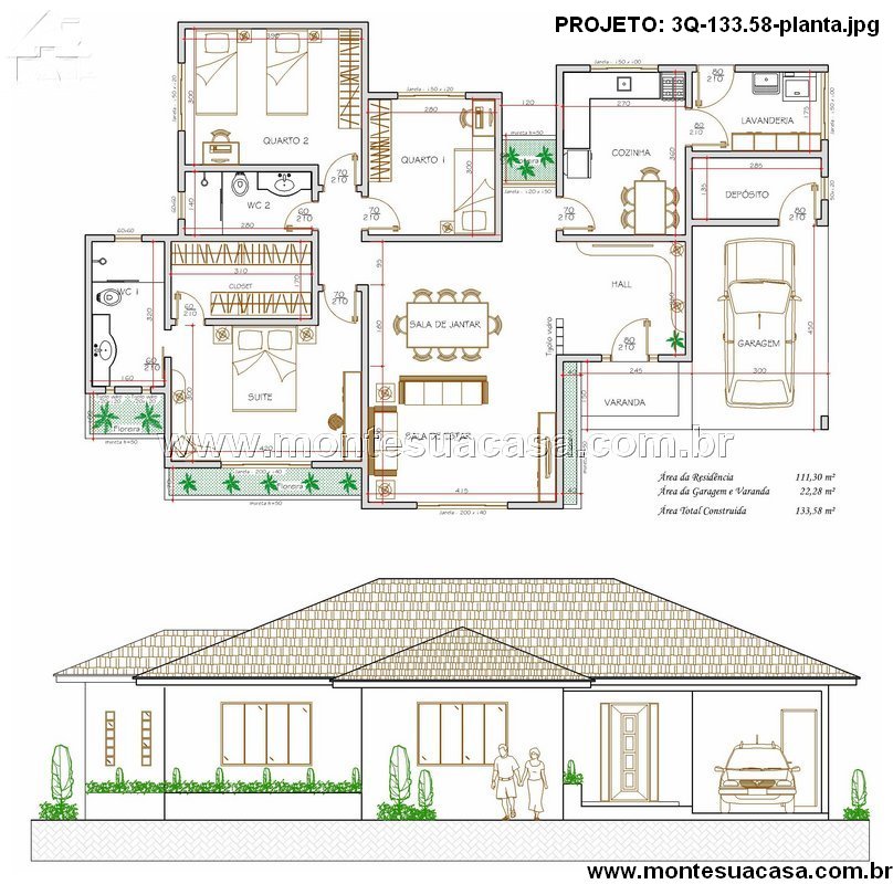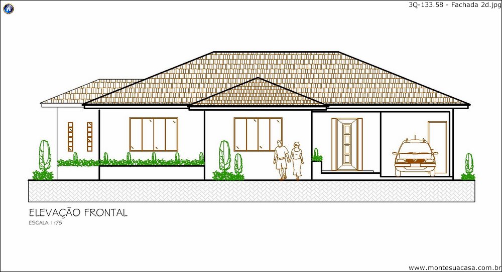 Com 111,30 m² de área residencial e 22,28 m² de garagem e varanda, o projeto 3Q-133.58 oferece uma excelente relação custo-benefício. Seu formato retangular facilita a adaptação em lotes urbanos ou de condomínio, exigindo pouco movimento de terra e reduzindo custos de construção.