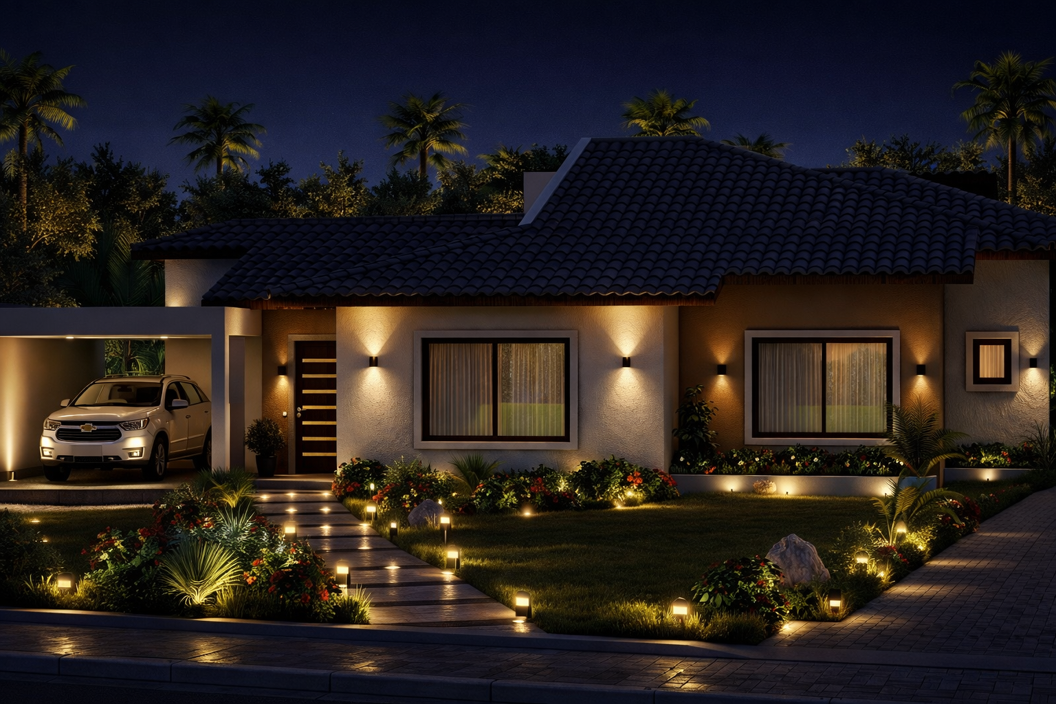 A fachada da casa apresenta linhas contemporâneas com telhado cerâmico e volumes bem definidos, valorizando o contraste de cores e texturas. O garagem coberta para dois carros garante praticidade, enquanto o jardim frontal com paisagismo sutil complementa o visual acolhedor.