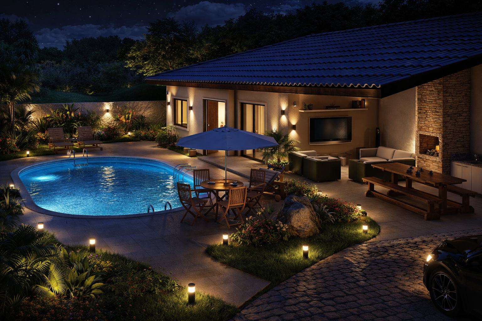 Ao entrar na residência, o morador é recebido por uma ampla sala de estar conectada à sala de jantar, favorecendo a iluminação natural e a ventilação cruzada. A cozinha, estrategicamente posicionada, se comunica diretamente com a área gourmet e com a piscina, facilitando o uso cotidiano e os momentos de lazer.