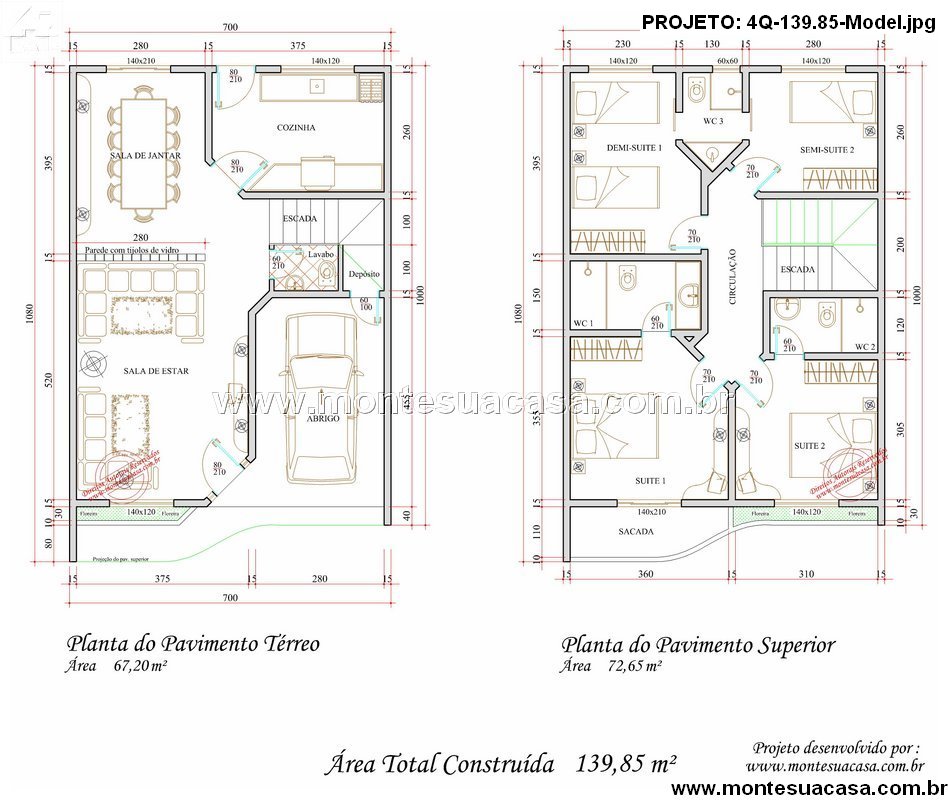 Subindo para o pavimento superior, de 72.65 m², você encontra a área íntima dedicada ao descanso. Este andar abriga quatro suítes, atendendo perfeitamente a uma família moderna. A Suite 1 se destaca com suas dimensões amplas e uma Sacada privativa, perfeita para momentos de relaxamento. As suítes 2, 3 e 4, incluindo duas semi-suítes, garantem conforto e privacidade para todos os moradores. Dois banheiros sociais (WC 1 e WC 2) complementam o andar, servindo os dormitórios de forma eficiente. O layout assegura que todos os cômodos aproveitem a iluminação e ventilação.