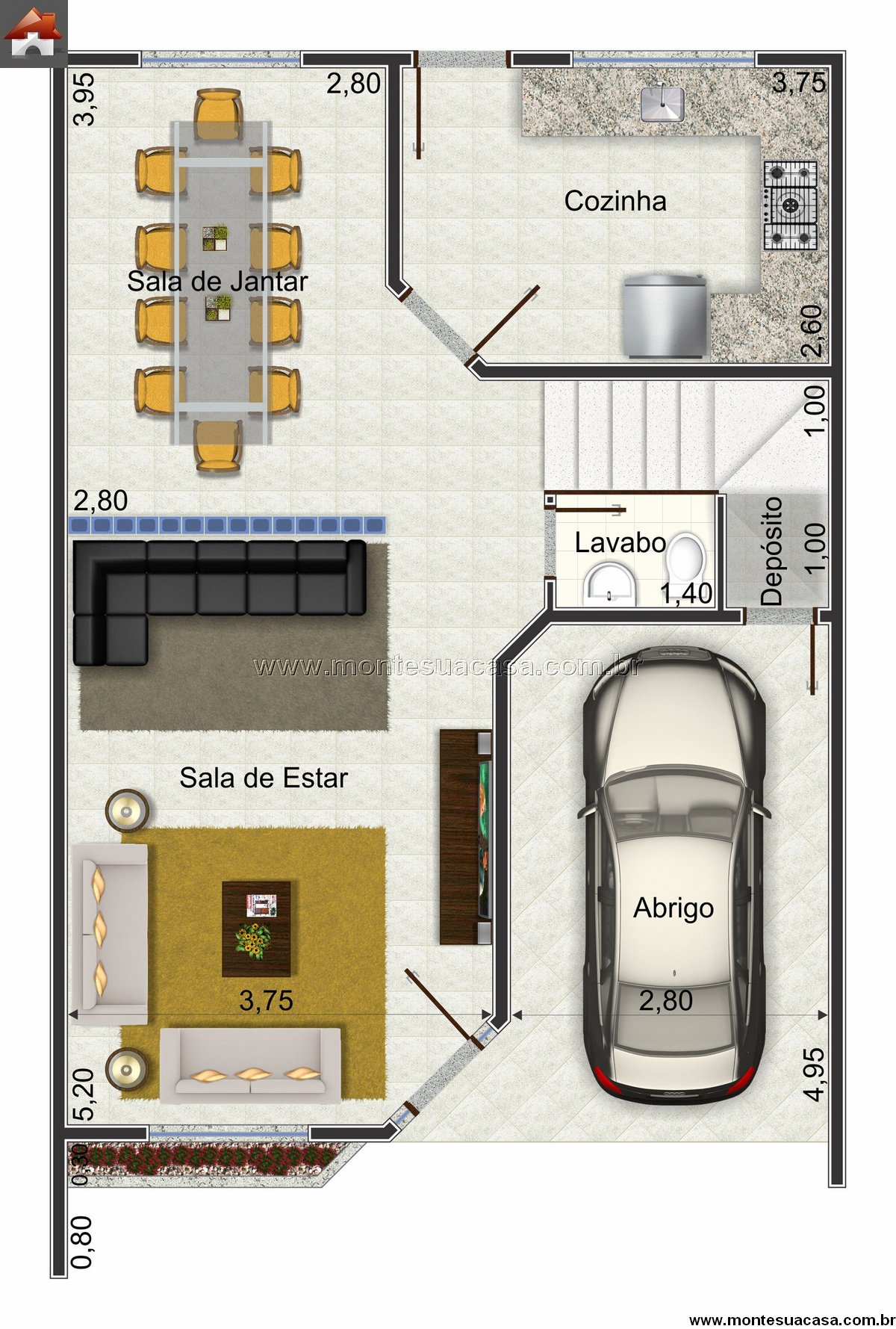 O pavimento térreo, com 67.20 m², é o coração da casa para convívio e recepção. A Sala de Estar e a Sala de Jantar se integram, criando um ambiente amplo e aconchegante para a família e visitas. A Cozinha, diretamente conectada à área de jantar, facilita o serviço e promove a interação durante preparos de refeições. Um Lavabo bem localizado atende os visitantes com discrição e praticidade. Um Depósito generoso oferece espaço suficiente para organizar itens de limpeza e mantimentos. A área de Abrigo proporciona uma transição suave entre a garagem e o interior da residência.