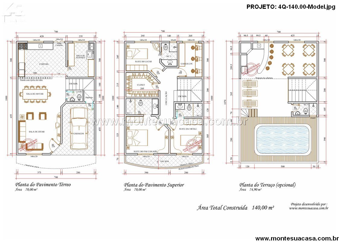 O projeto inclui a opção de um terraço com 74,90m², um espaço adicional que pode ser adaptado como área de lazer, jardim ou local para contemplação. A circulação entre os pavimentos é resolvida com uma escada interna, posicionada de forma a otimizar o fluxo. A projeção da cobertura e os beirais de 0,40m conferem um acabamento clean e proteção às elevações. A construção total de 140,00m² reflete um excelente custo-benefício, unindo um layout contemporâneo a soluções arquitetônicas que valorizam cada metro quadrado.