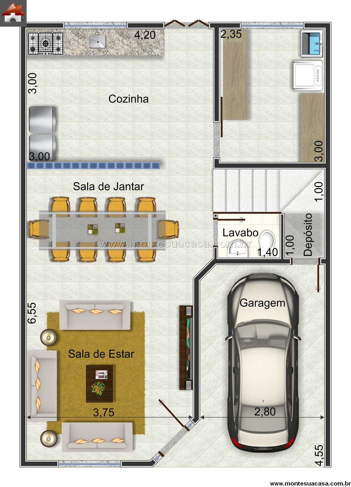 O acesso à casa se dá pela garagem espaçosa, que oferece praticidade e segurança. A área social do térreo foi meticulosamente planejada para promover integração e convívio. Uma generosa Sala de Estar de 6,55m se conecta fluentemente com a Sala de Jantar e a Cozinha, ambas com 3,00m, criando um ambiente amplo e aconchegante para receber visitas. Completando este pavimento, um Lavabo oferece comodidade aos visitantes, e um Depósito de 1,00m proporciona organização, afastando a desordem dos espaços de vivência.