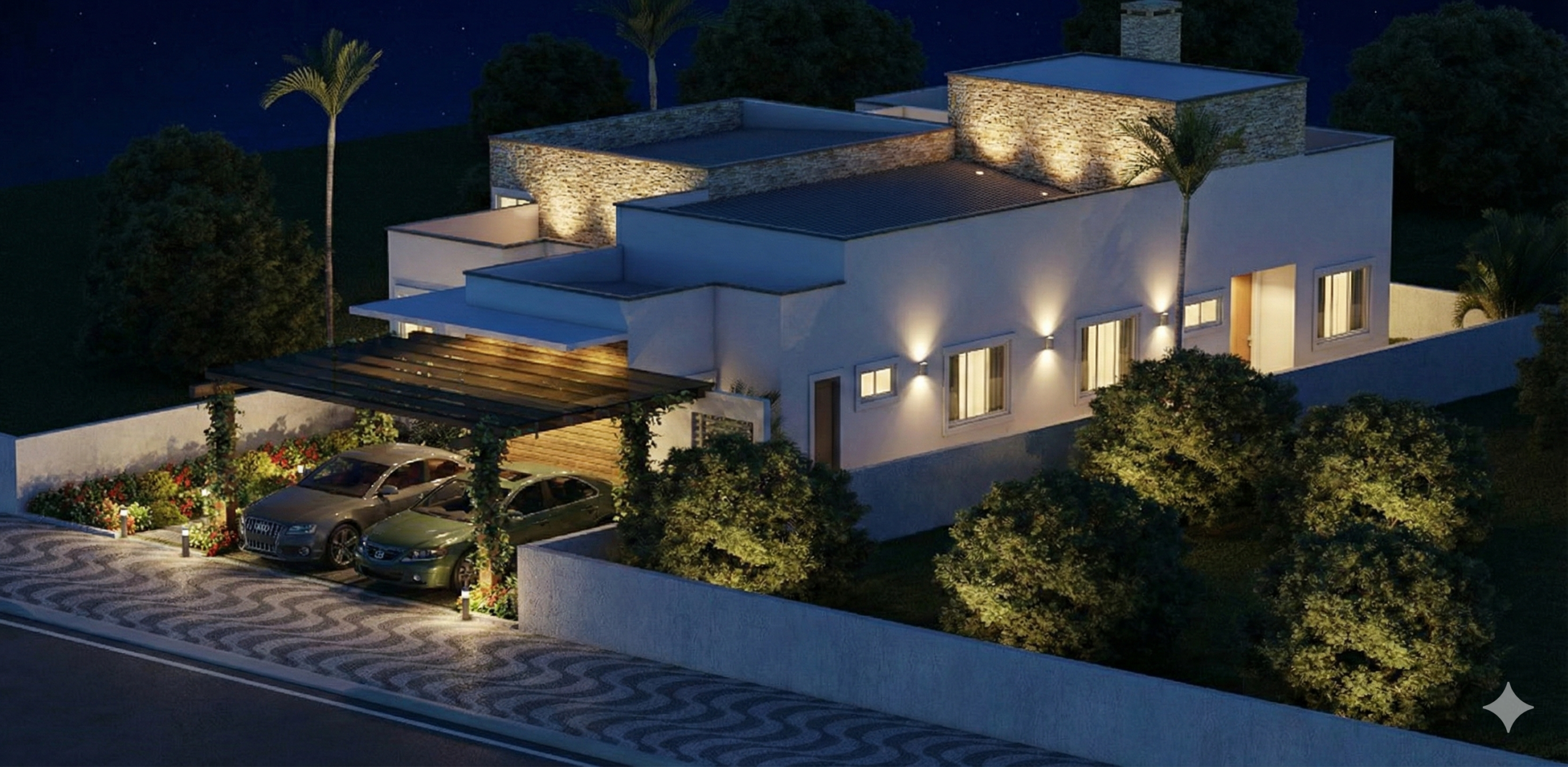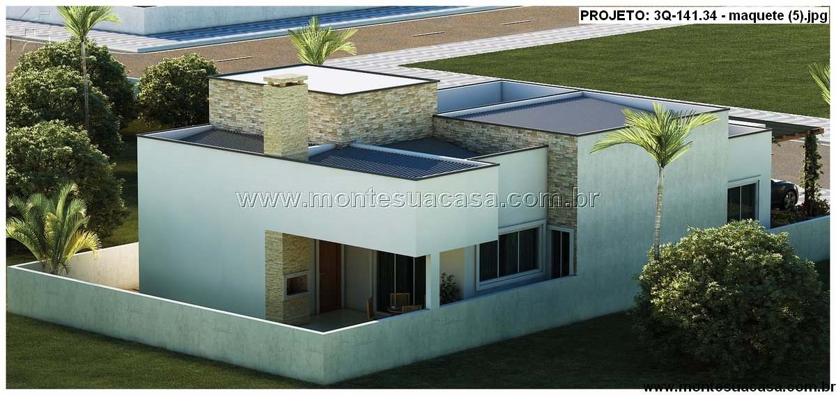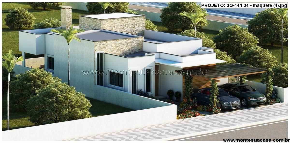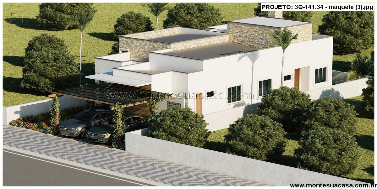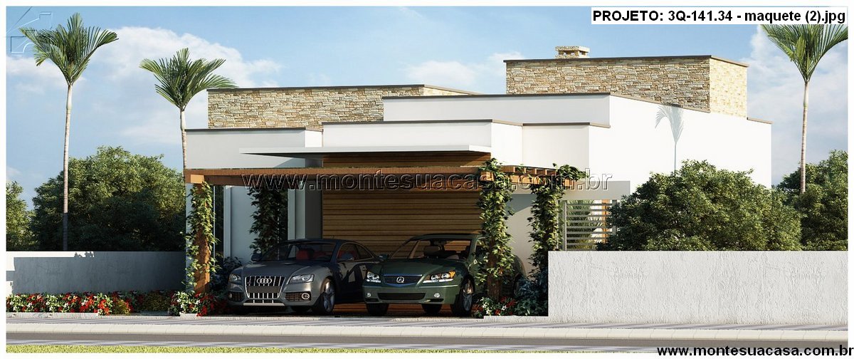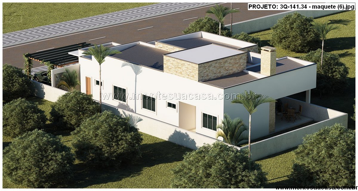 Este projeto de casa térrea com 141,34m² foi desenvolvido para oferecer conforto, elegância e praticidade em todos os ambientes. A fachada moderna se destaca pelo uso de revestimentos em pedra natural combinados com volumes brancos e linhas retas, criando uma composição arquitetônica imponente e contemporânea. O telhado embutido e o pergolado de madeira sobre a garagem trazem um toque sofisticado e acolhedor ao visual da residência.