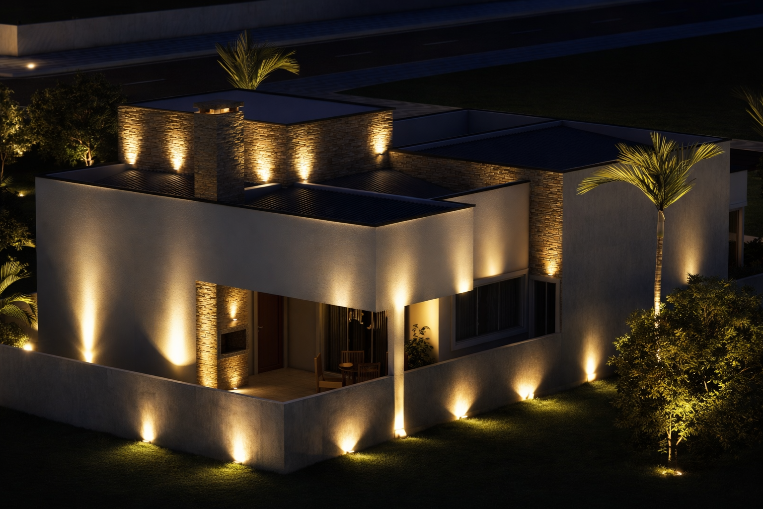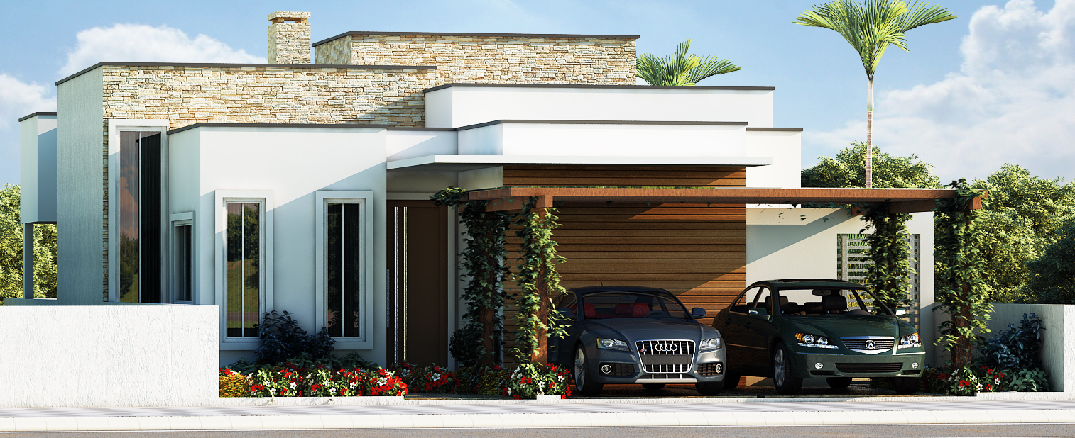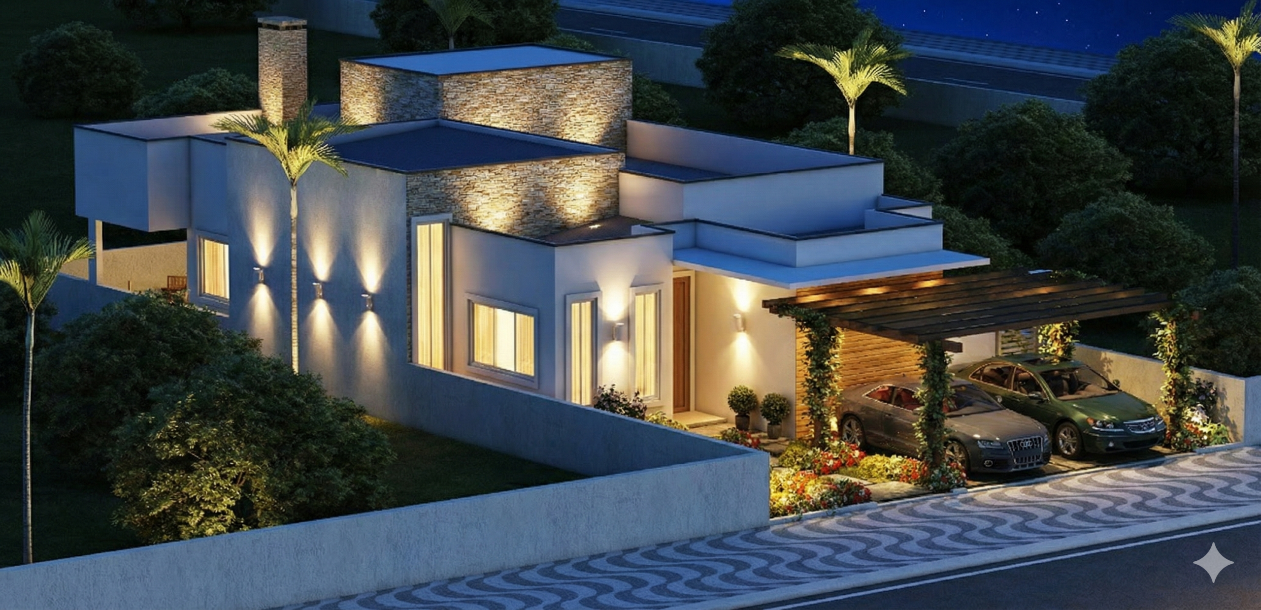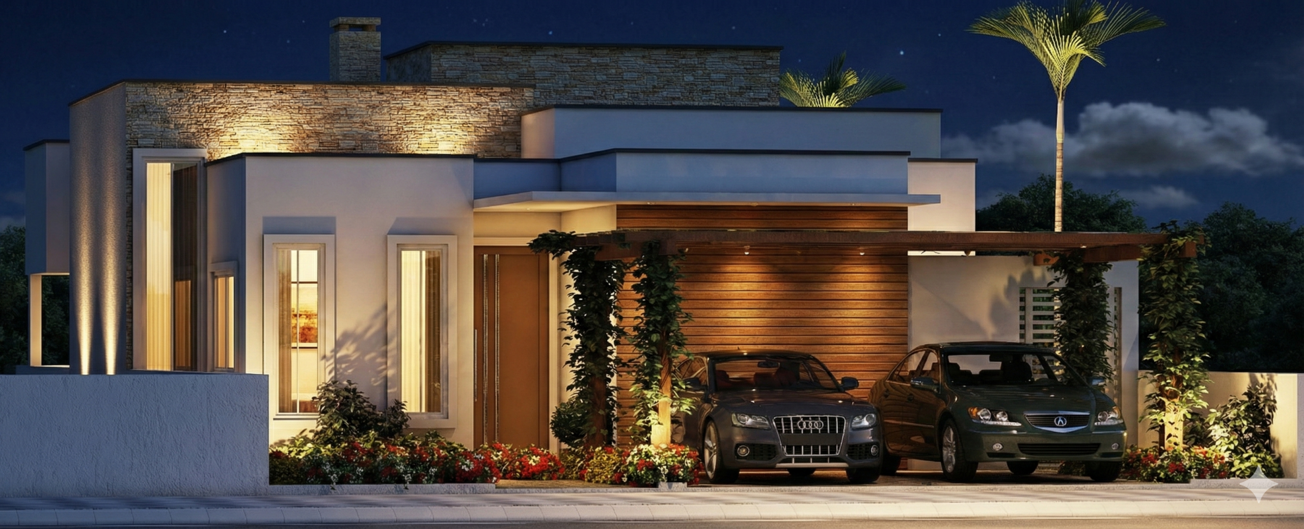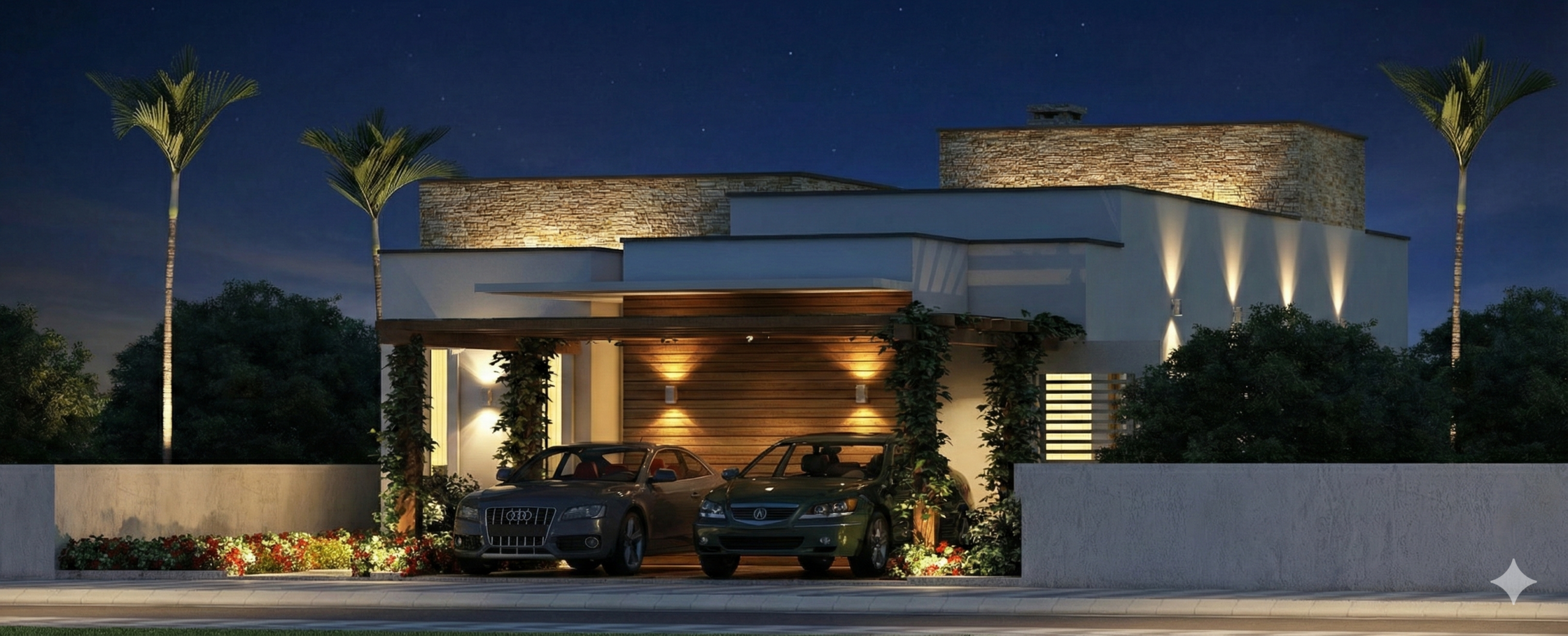 Este projeto de casa térrea com 141,34m² foi desenvolvido para oferecer conforto, elegância e praticidade em todos os ambientes. A fachada moderna se destaca pelo uso de revestimentos em pedra natural combinados com volumes brancos e linhas retas, criando uma composição arquitetônica imponente e contemporânea. O telhado embutido e o pergolado de madeira sobre a garagem trazem um toque sofisticado e acolhedor ao visual da residência.