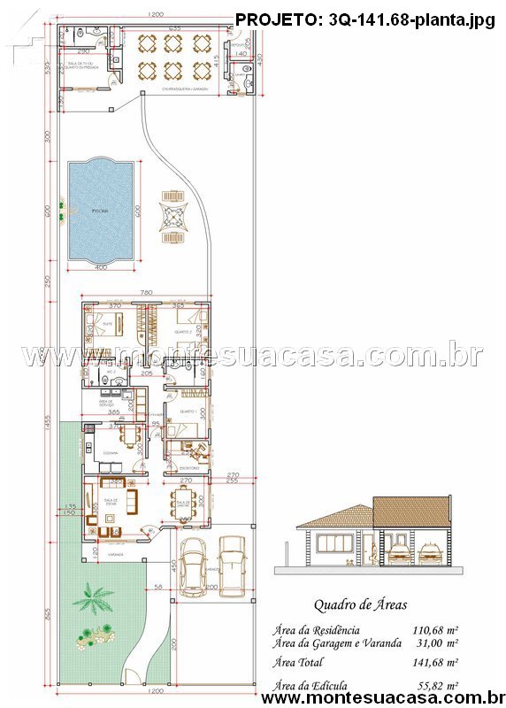 Com 31,00 m² de garagem e varanda, o total de 141,68 m² construídos é distribuído de forma equilibrada entre os setores social, íntimo e de lazer. O resultado é um projeto versátil, indicado tanto para terrenos urbanos quanto de recreio, oferecendo funcionalidade, beleza e excelente aproveitamento do espaço disponível.