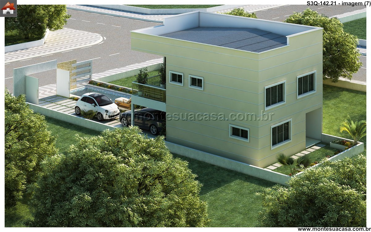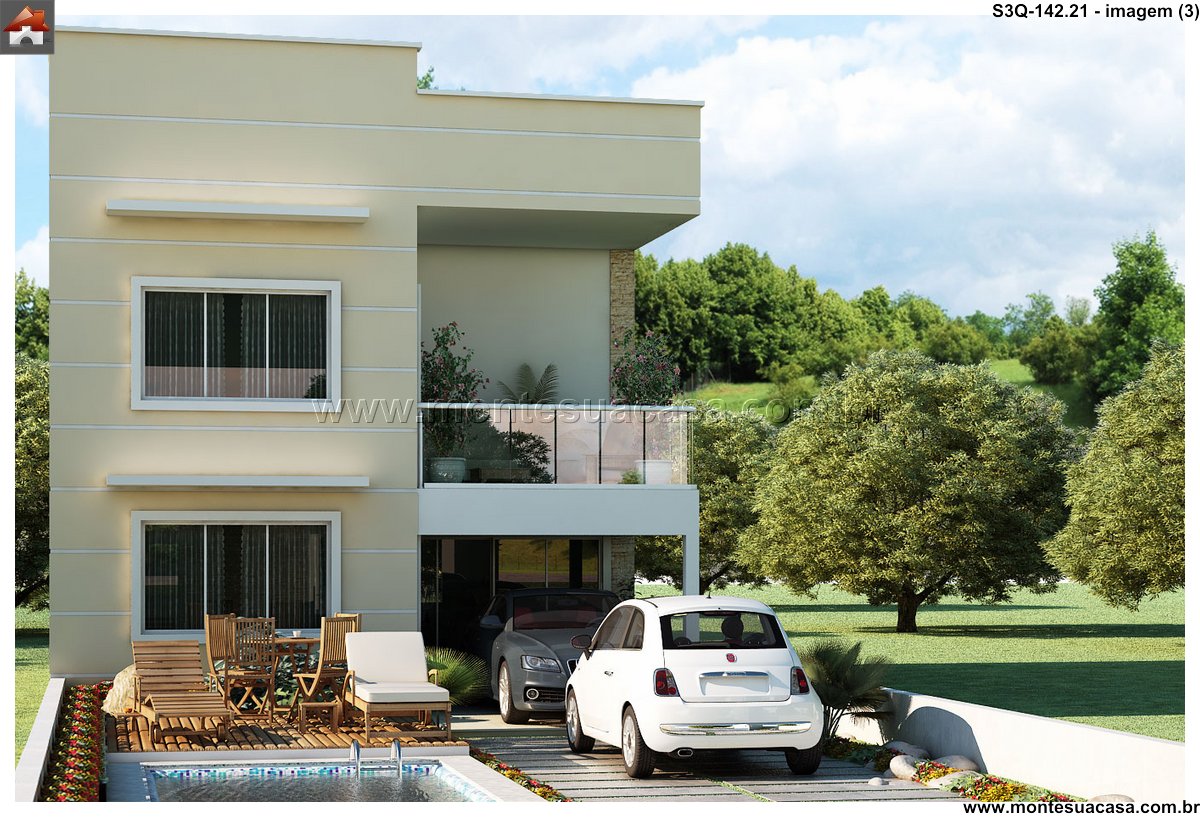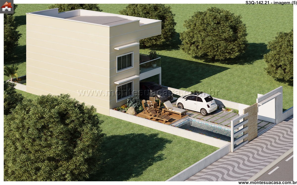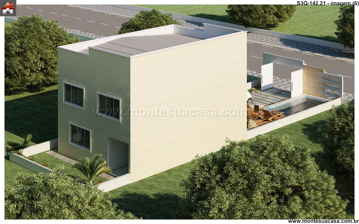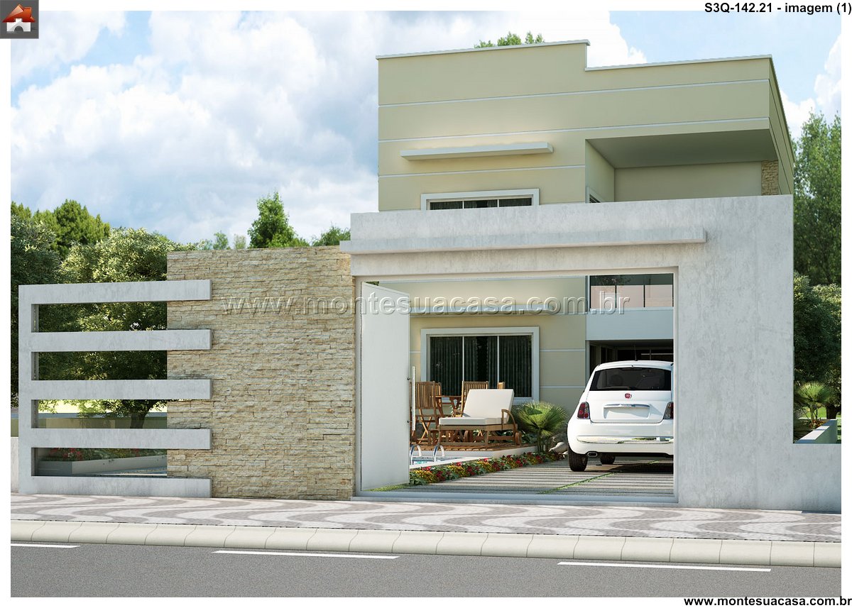 Projeto moderno com integração entre lazer e funcionalidade Este projeto de sobrado de 3 quartos com 142,21m² combina sofisticação, conforto e aproveitamento inteligente dos espaços. A fachada contemporânea apresenta linhas retas, grandes aberturas envidraçadas e acabamentos em tons neutros, criando uma estética elegante e atemporal. O uso de materiais como concreto, madeira e vidro reforça o estilo moderno e valoriza a iluminação natural.