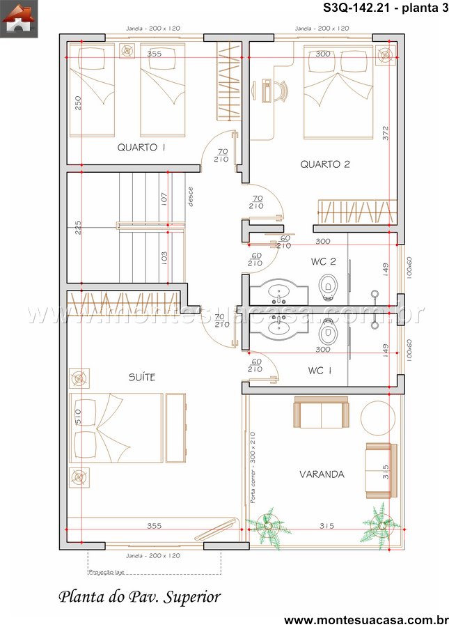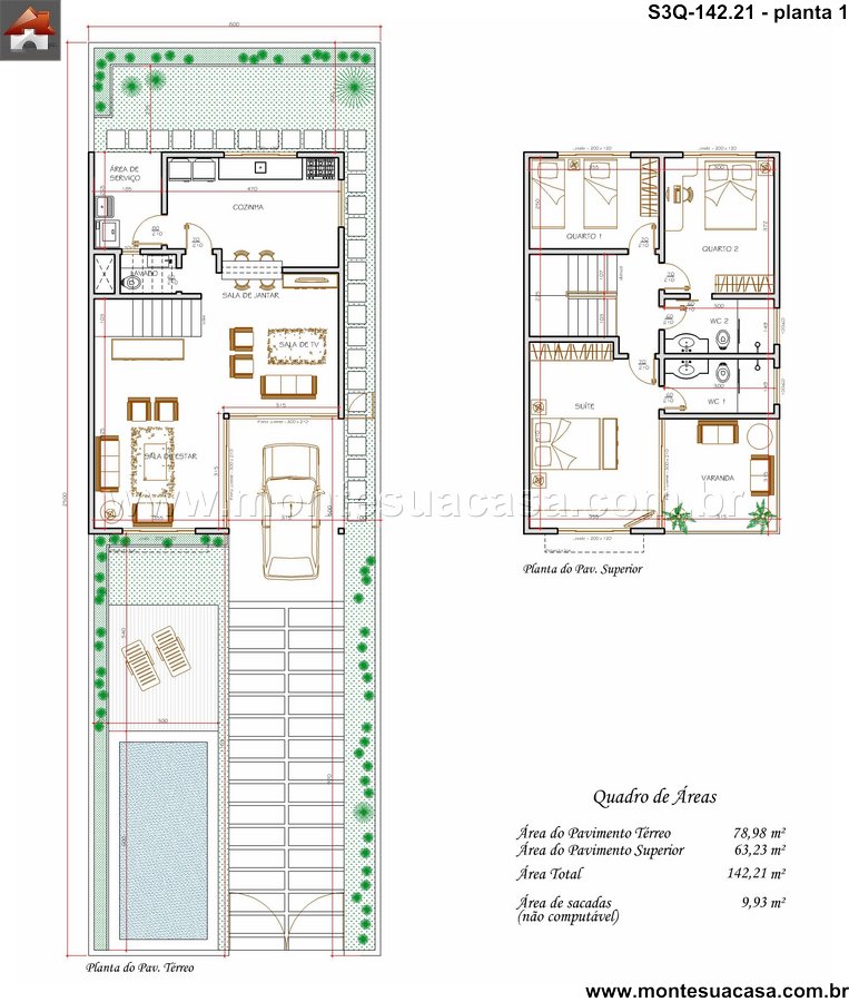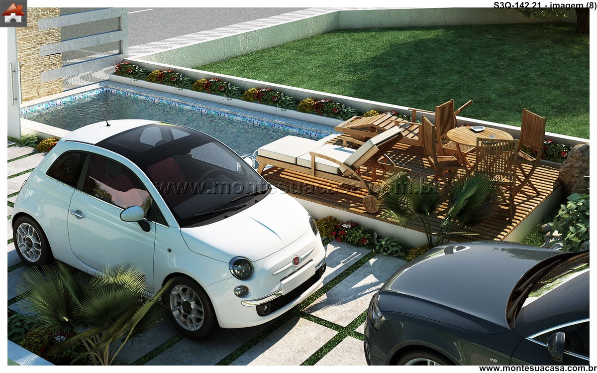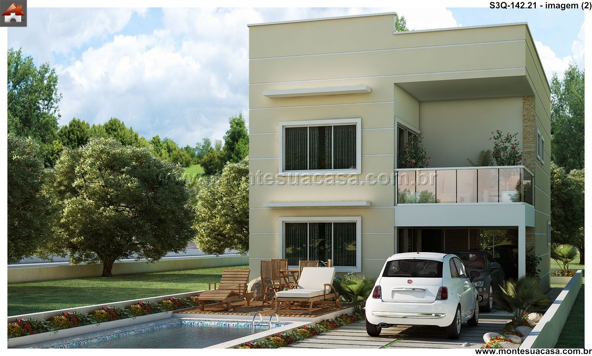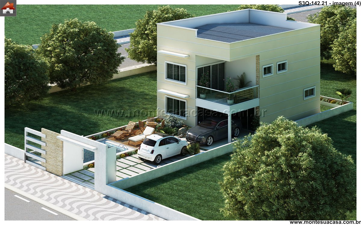 Projeto moderno com integração entre lazer e funcionalidade Este projeto de sobrado de 3 quartos com 142,21m² combina sofisticação, conforto e aproveitamento inteligente dos espaços. A fachada contemporânea apresenta linhas retas, grandes aberturas envidraçadas e acabamentos em tons neutros, criando uma estética elegante e atemporal. O uso de materiais como concreto, madeira e vidro reforça o estilo moderno e valoriza a iluminação natural.