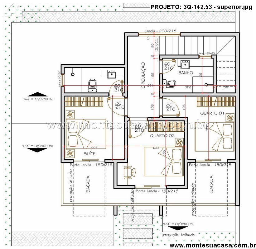 No andar superior, o projeto apresenta três dormitórios, sendo uma suíte espaçosa com sacada privativa. Os outros dois quartos dividem um banheiro social bem distribuído e iluminado. A circulação é otimizada, garantindo conforto e fluidez nos ambientes. As portas-janelas proporcionam excelente iluminação natural e ventilação cruzada, criando uma atmosfera agradável e aconchegante.