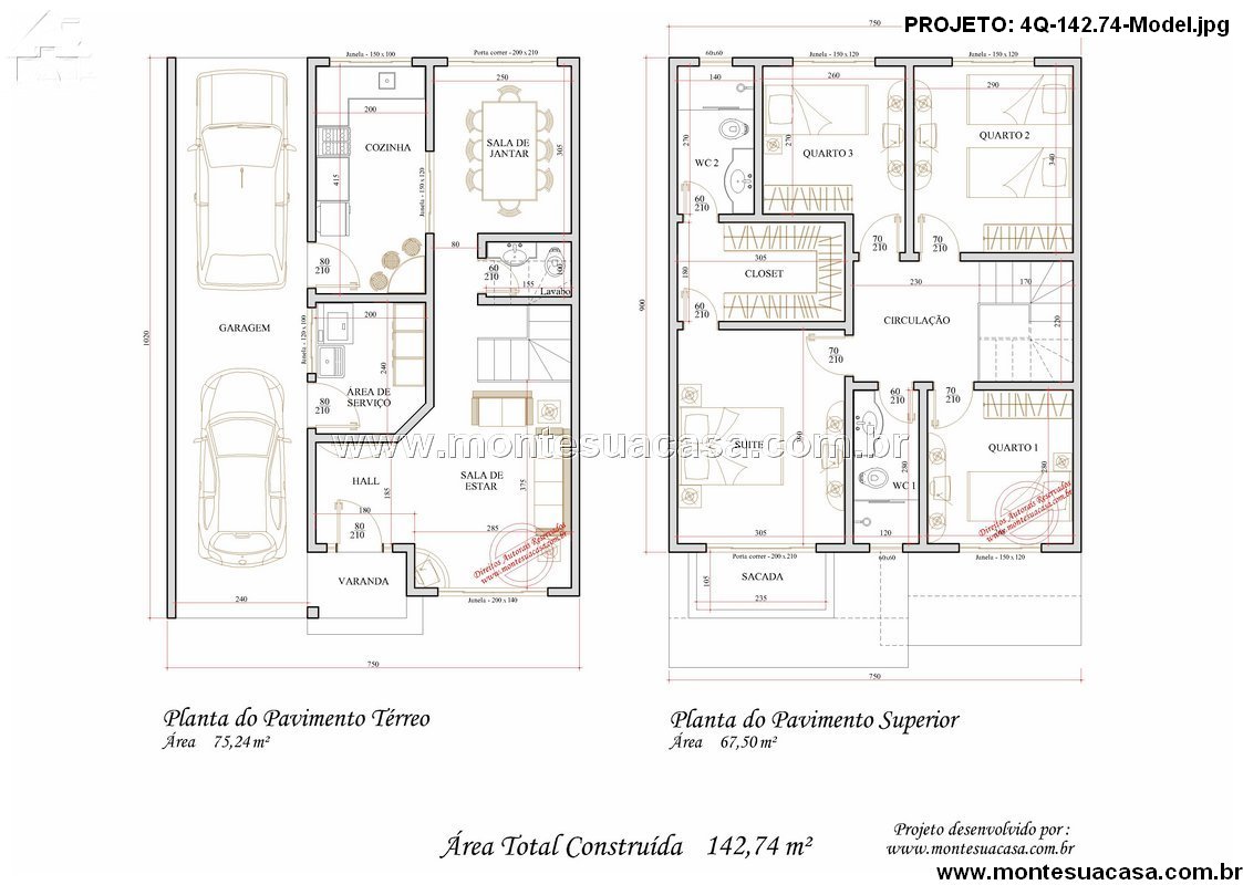 Este projeto de casa em dois pavimentos, totalizando 142,74m² de área construída, foi meticulosamente planejado para oferecer uma experiência de moradia completa e funcional para a família moderna. A distribuição inteligente dos ambientes entre o térreo e o superior garante uma perfeita harmonia entre os espaços sociais e íntimos, promovendo tanto a convivência quanto a privacidade. O térreo, com seus 75,24m², é dedicado integralmente à vida social e às atividades de serviço, criando um fluxo contínuo e acolhedor. Já o pavimento superior, com 67,50m², abriga os dormitórios, assegurando um refúgio tranquilo e organizado. A arquitetura prioriza a luminosidade natural, a ventilação cruzada e a sensação de amplitude, resultando em um lar que é ao mesmo tempo convidativo e extremamente prático para o dia a dia.