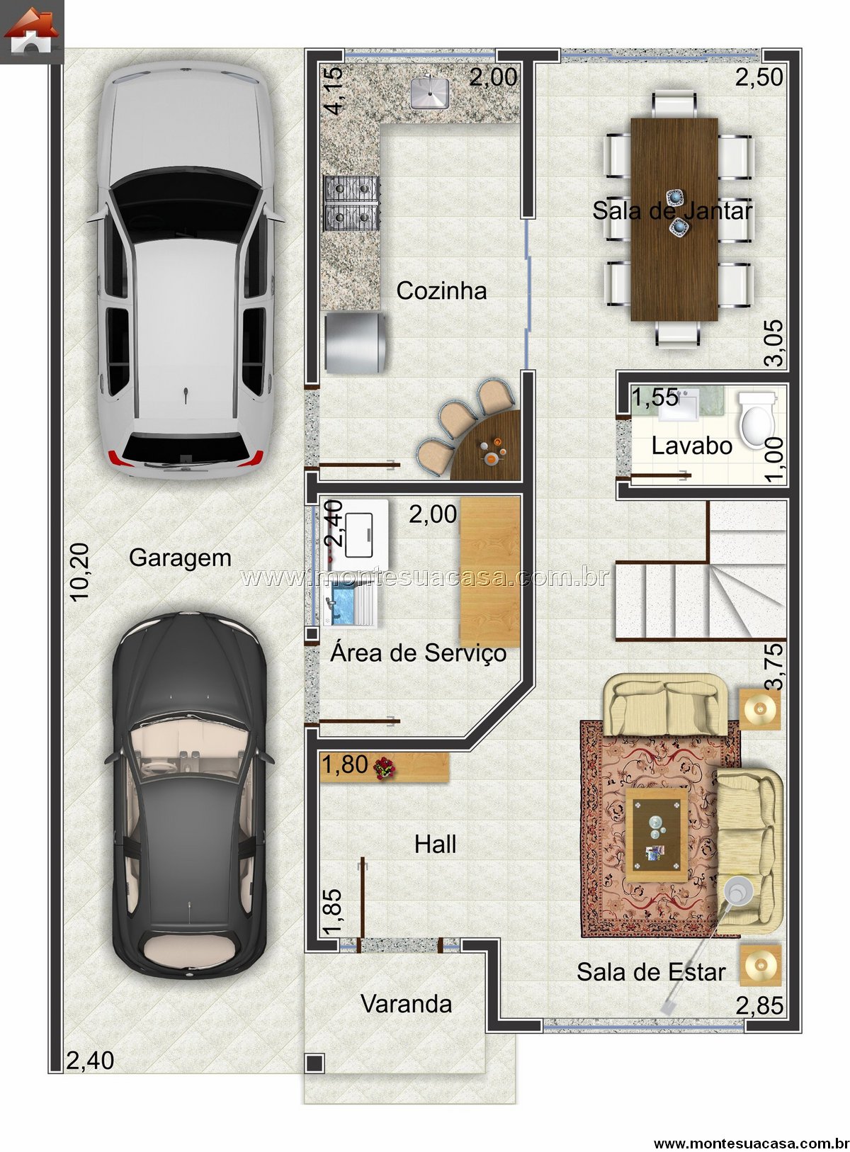 Ao acessar a residência, você é recebido por uma garagem espaçosa, que garante segurança e comodidade para os veículos. A área de serviço, estrategicamente posicionada, oferece independência e facilidade para as tarefas domésticas. Um hall de entrada conduz elegantemente aos ambientes principais. A varanda serve como uma transição graciosa entre o exterior e o interior, levando você diretamente para a ampla sala de estar. Este ambiente integra-se harmonicamente com a sala de jantar, criando um único e vasto espaço para entretenimento e reuniões familiares. A cozinha, planejada para ser funcional, mantém uma conexão visual com a área social, permitindo que o morador interaja com os visitantes enquanto prepara refeições. O lavabo social, localizado próximo à entrada, proporciona total conveniência para os hóspedes.