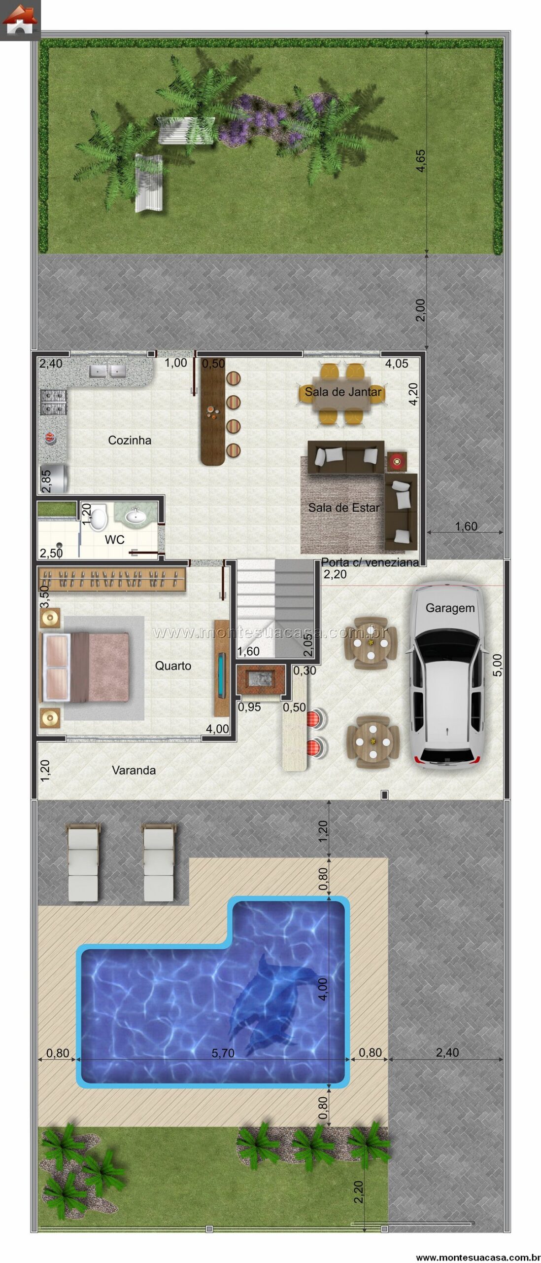 O projeto foi pensado para lotes a partir de 10 metros de largura. A garagem coberta integra-se à fachada sem comprometer a estética, e o recuo frontal favorece o paisagismo. O conjunto cria uma atmosfera acolhedora e moderna, perfeita para quem deseja unir lazer, conforto e valorização do imóvel.