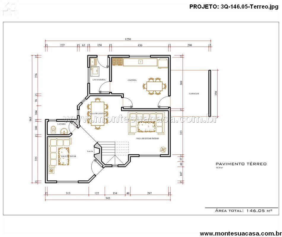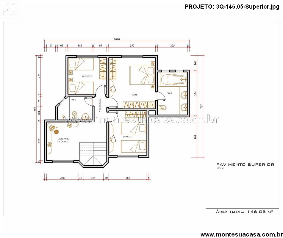 Projeto de Sobrado com 3 Quartos e 146,05m²
