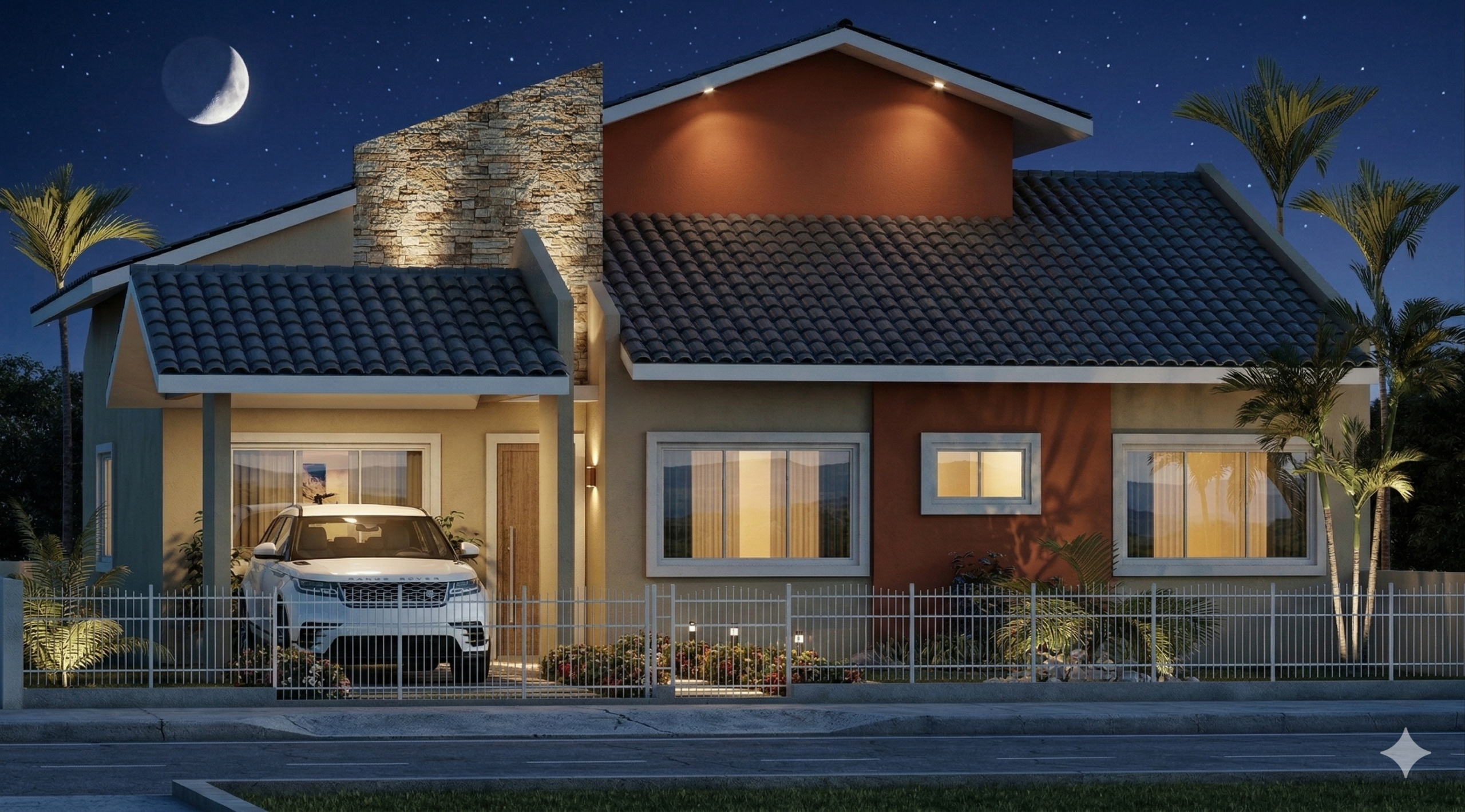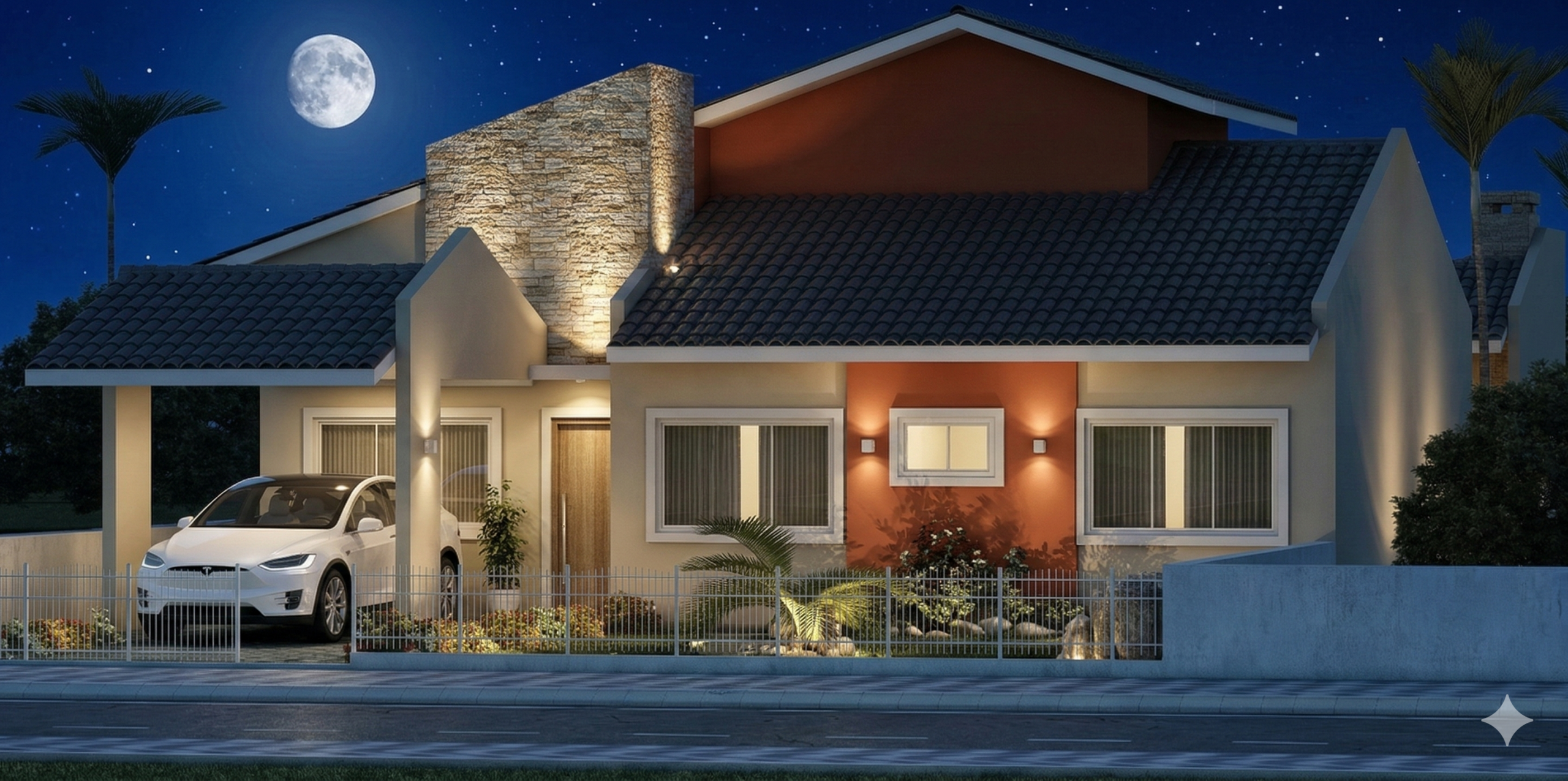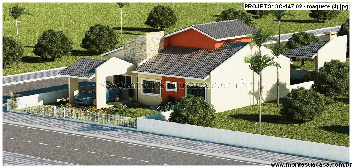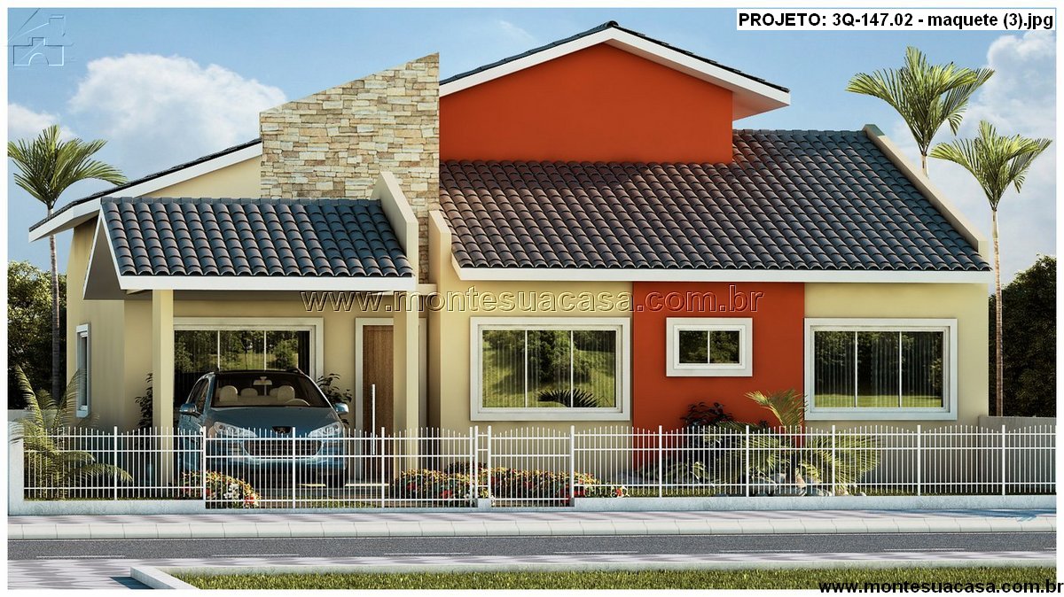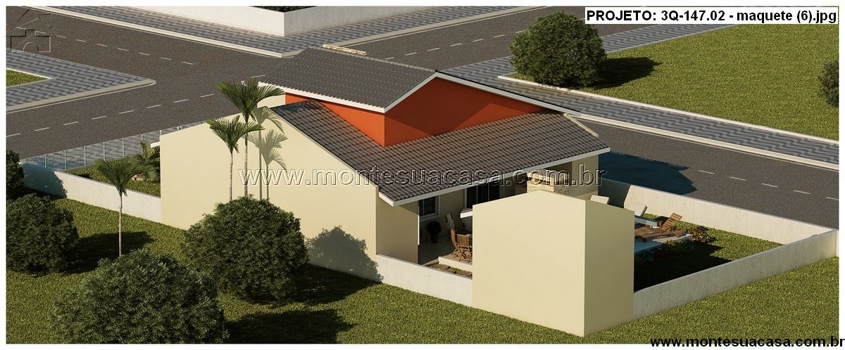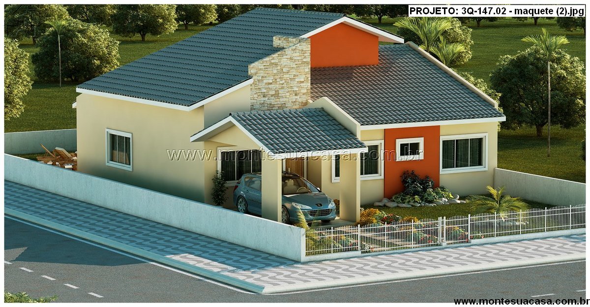 Este projeto de casa térrea com 3 quartos e 147,02 m² apresenta um design moderno e acolhedor, ideal para famílias que valorizam conforto, lazer e integração dos ambientes. A fachada combina tons quentes com detalhes em pedra natural e telhas cerâmicas escuras, criando uma estética elegante e atemporal.