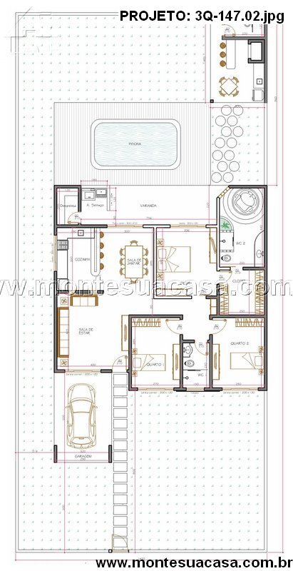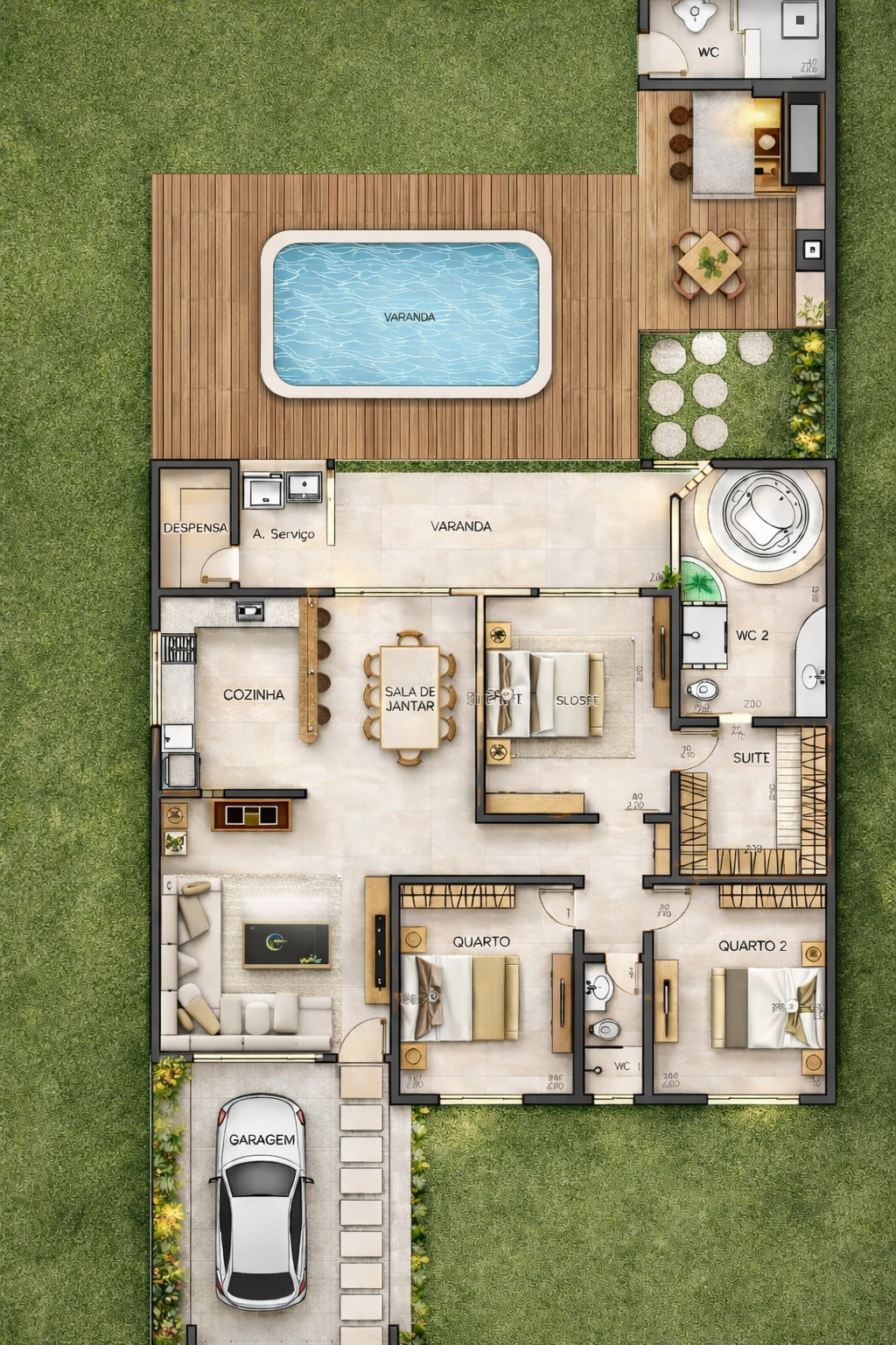 O destaque deste modelo é a área de lazer completa no fundo do terreno, que inclui piscina, varanda coberta e um charmoso espaço gourmet com churrasqueira. Essa configuração proporciona um ambiente perfeito para reunir amigos e familiares em momentos de descontração.
