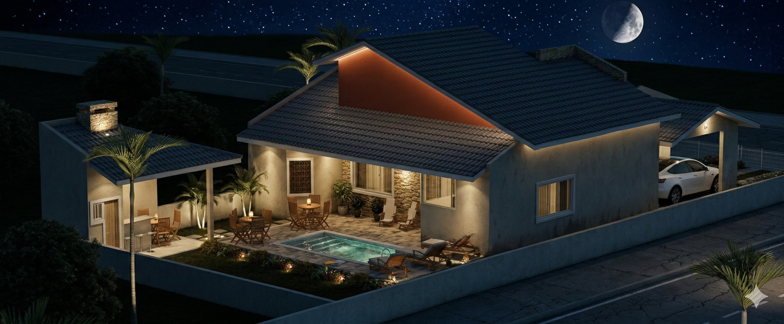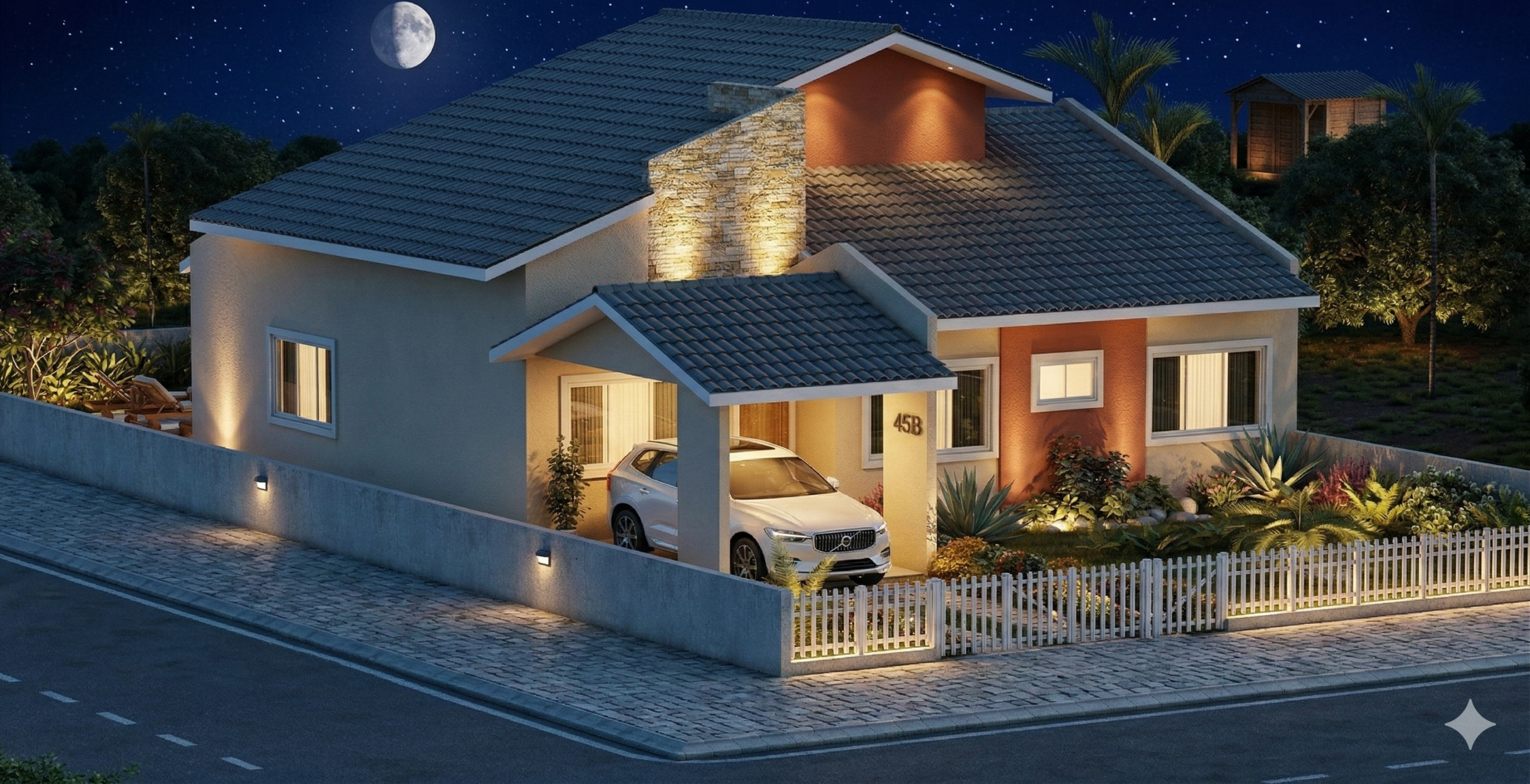 Esse modelo é ideal para terrenos médios, valorizando tanto o conforto interno quanto o espaço externo de convivência. A casa combina estética contemporânea com funcionalidade, resultando em um projeto que equilibra beleza, praticidade e lazer em um único pavimento.
