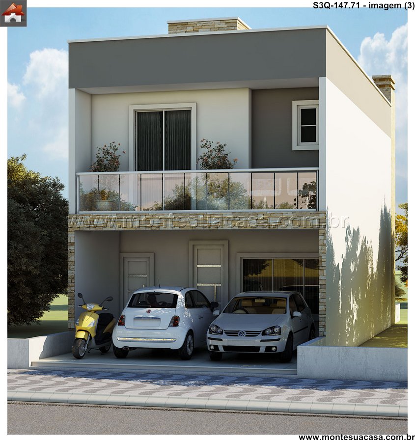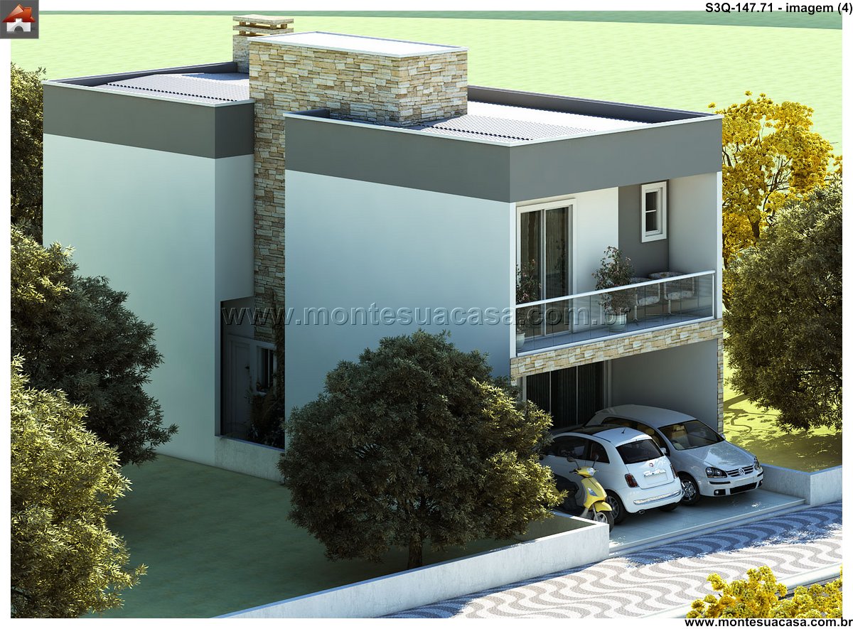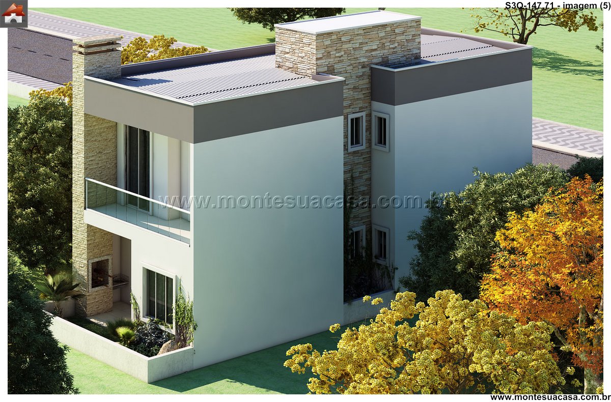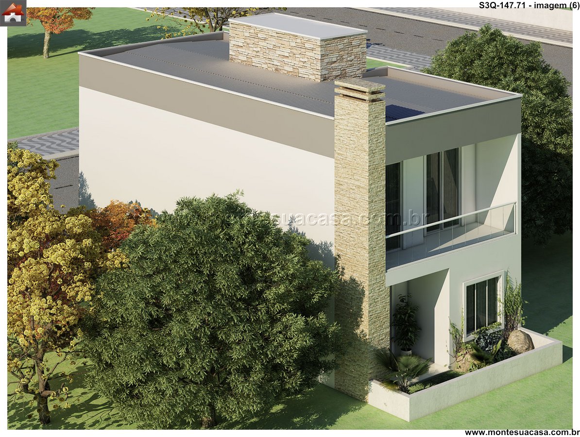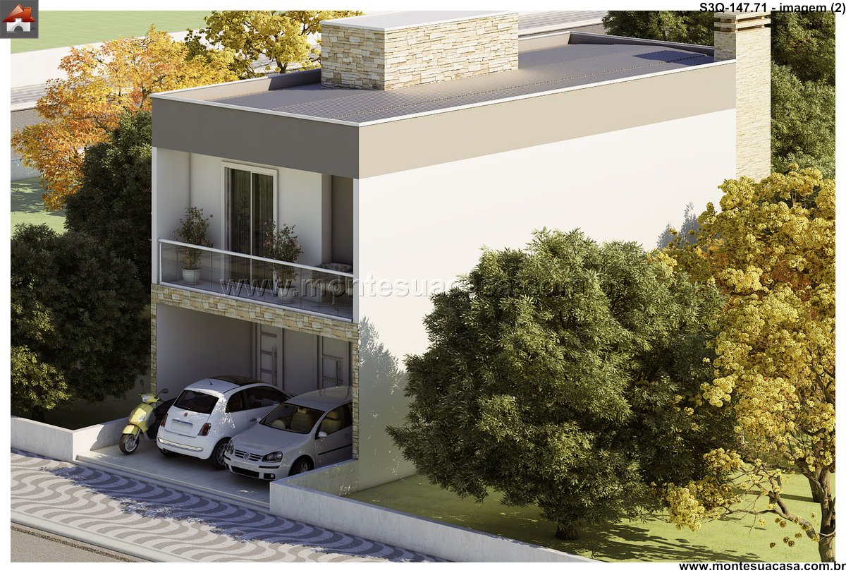 Projeto moderno com funcionalidade e estilo Este projeto de casa sobrado com 147,71m² combina estética contemporânea com soluções funcionais para o dia a dia. A fachada apresenta linhas retas, volumes bem definidos e uma paleta de cores neutras com detalhes em pedra natural, conferindo sofisticação e personalidade ao imóvel. O telhado plano reforça o estilo moderno, enquanto a sacada com guarda-corpo de vidro adiciona leveza e integração visual com o entorno arborizado.