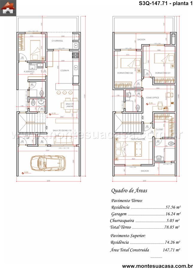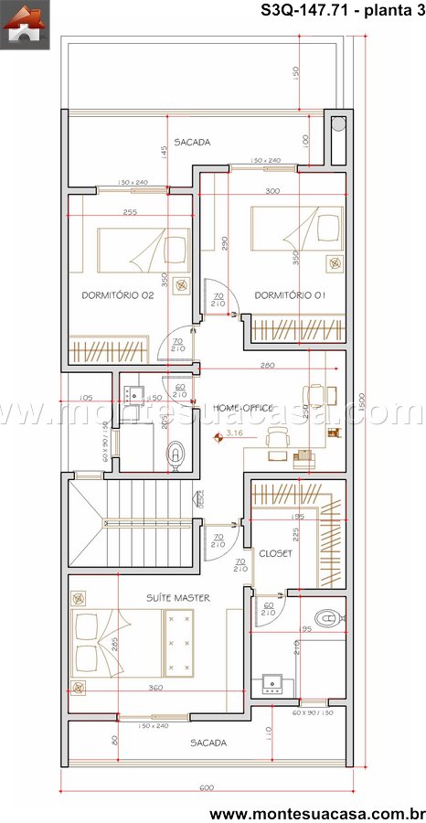 Conforto e privacidade no pavimento superior O andar superior abriga três dormitórios, incluindo uma suíte master com closet e banheiro privativo. Os dormitórios 01 e 02 compartilham um banheiro social, enquanto o home office oferece um espaço dedicado ao trabalho ou estudo. A sacada frontal proporciona ventilação cruzada e vista para a área externa, valorizando o conforto térmico e a iluminação natural.