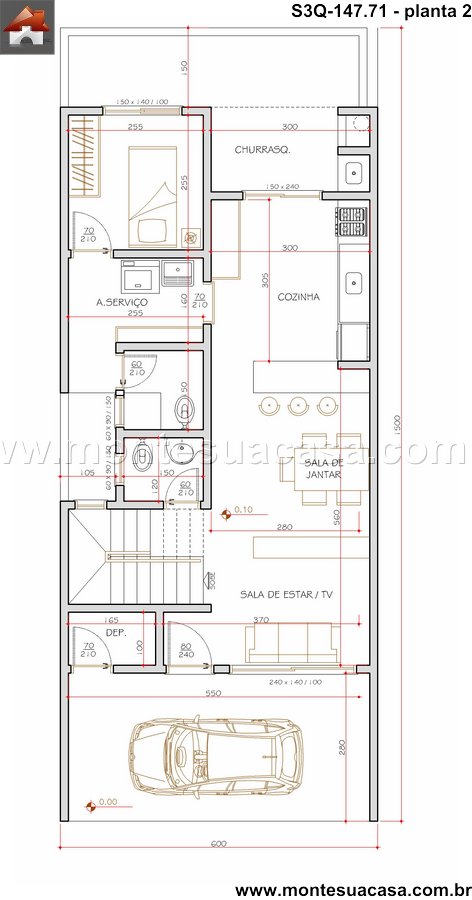 Ambientes integrados no pavimento térreo No térreo, os espaços foram pensados para promover convivência e praticidade. A garagem coberta comporta dois veículos e uma scooter, com acesso direto à sala de estar/TV. A sala de jantar se conecta à cozinha em conceito aberto, facilitando a circulação e o uso cotidiano. Ao fundo, a área de serviço e a churrasqueira coberta oferecem funcionalidade e lazer em um mesmo ambiente. Um lavabo completa o pavimento com discrição e eficiência.