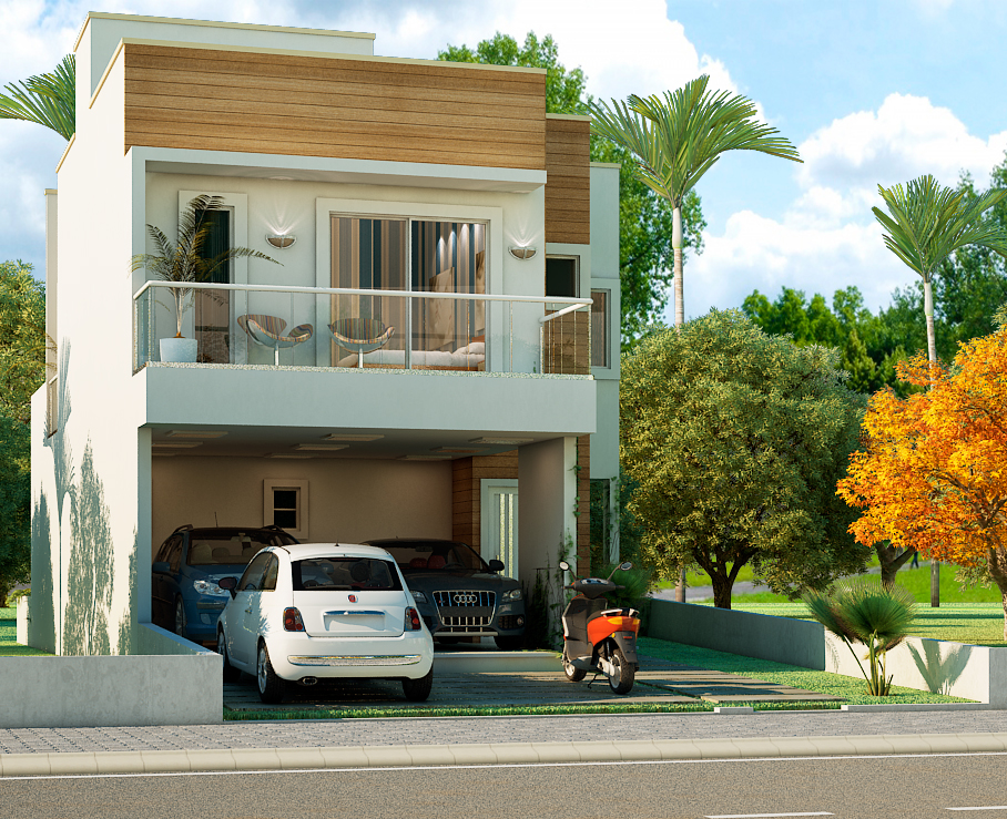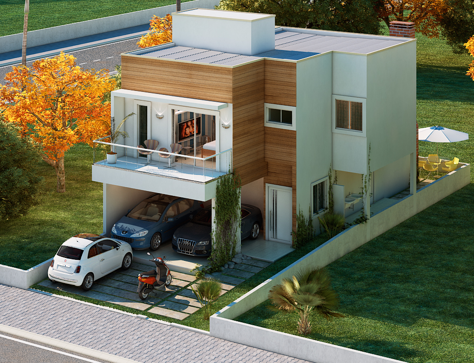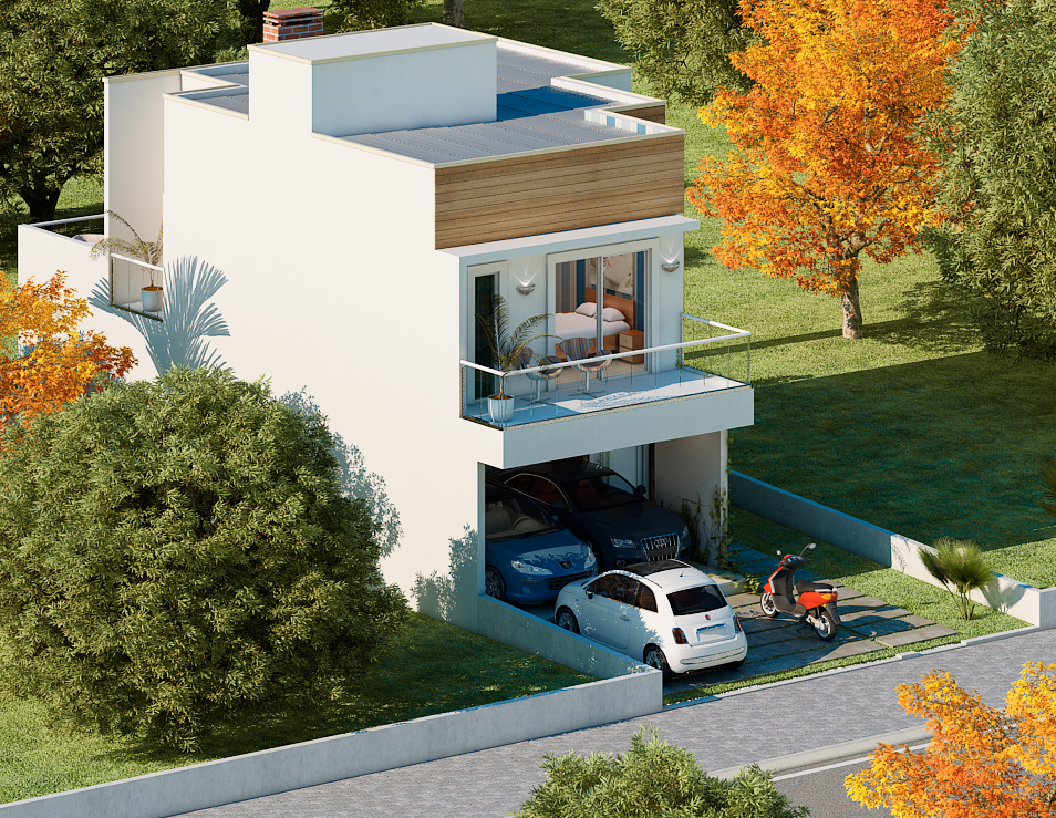 Ambientes sociais integrados e bem distribuídos No pavimento térreo, o layout prioriza a integração entre sala de estar, sala de jantar e cozinha em conceito aberto. Essa configuração favorece a convivência familiar e proporciona amplitude visual. A área externa conta com um pequeno jardim e espaço para refeições ao ar livre, ideal para momentos de lazer. A garagem coberta acomoda até três veículos, com acesso direto à entrada principal.