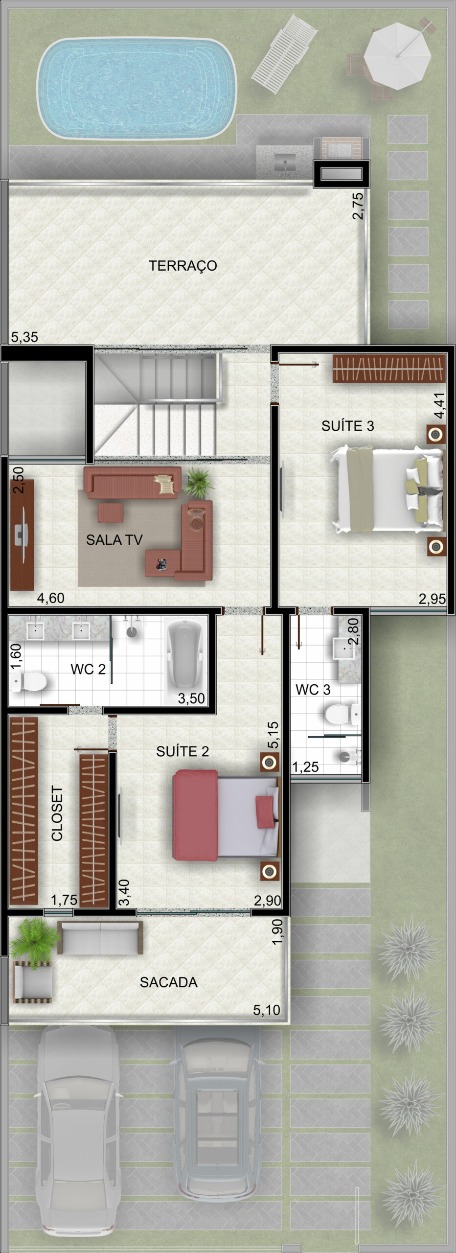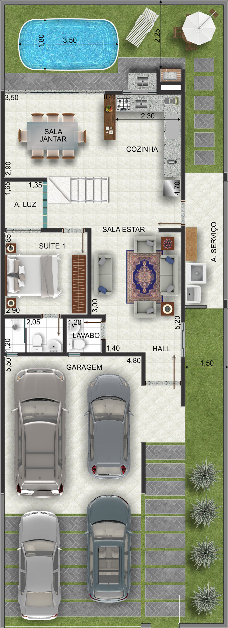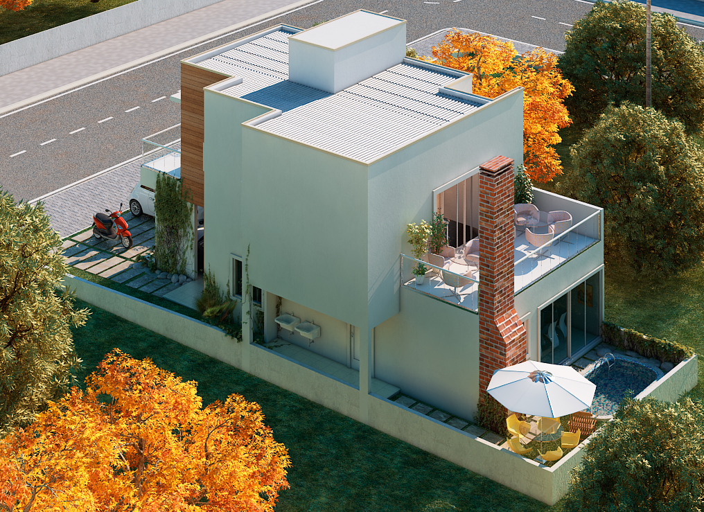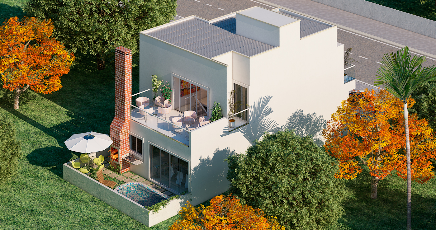Detalhes que valorizam o projeto O sobrado inclui lavabo no térreo, área de serviço funcional e escada central com iluminação zenital. O paisagismo foi pensado para harmonizar com a arquitetura, utilizando espécies tropicais e árvores de folhagem vibrante. O projeto também contempla infraestrutura para instalação de painéis solares e sistema de reaproveitamento de água pluvial.