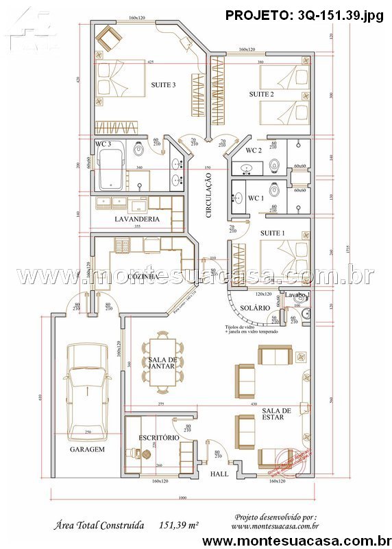 Projeto de casa térrea com 3 suítes e mezanino de 151,39m²