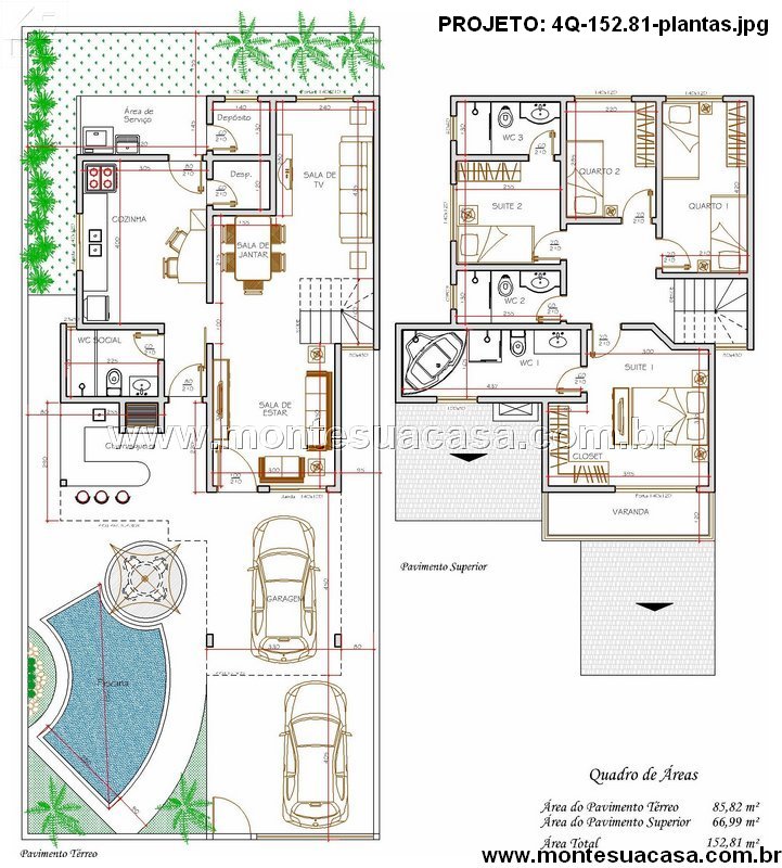 Este projeto de sobrado com 152,81 m² combina elegância, conforto e funcionalidade em um design moderno e bem distribuído. Ideal para famílias que valorizam espaços integrados e momentos de lazer, o layout privilegia a convivência, com uma ampla área social no térreo e ambientes íntimos no pavimento superior.