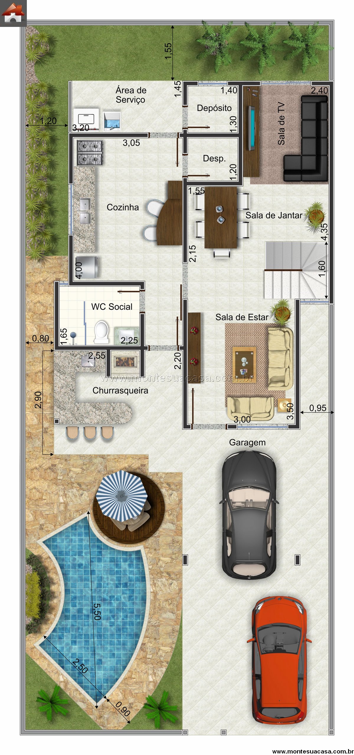 No andar térreo, a casa apresenta uma sala de estar espaçosa, conectada à sala de jantar e à sala de TV, criando um ambiente contínuo e iluminado. A cozinha, estrategicamente posicionada, oferece acesso direto à área de churrasqueira coberta, ideal para confraternizações. O WC social atende tanto à área interna quanto à área externa.