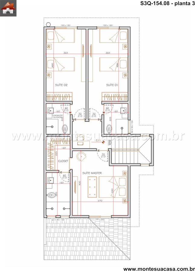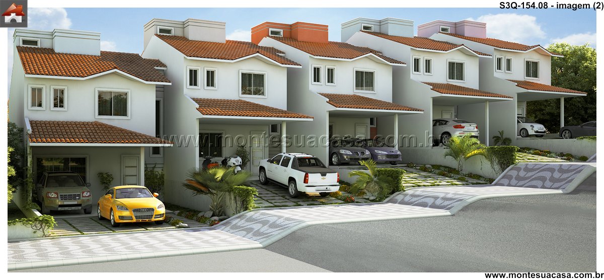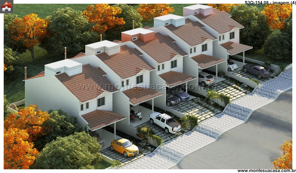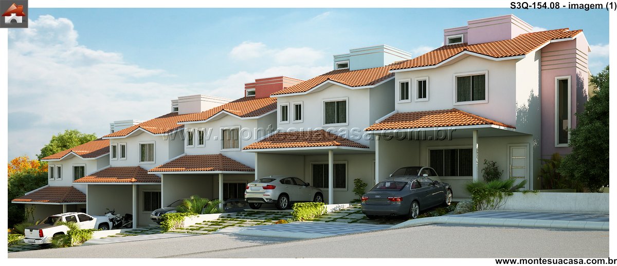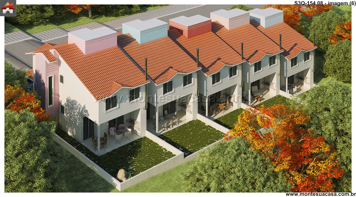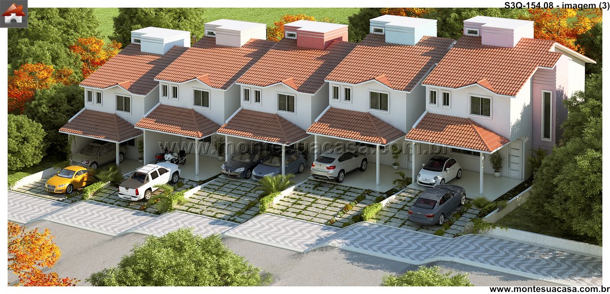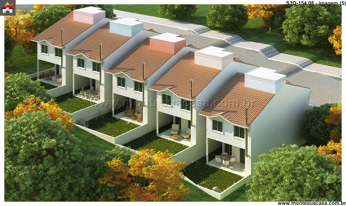 Implantação em rua com declive As imagens 3D do projeto representam cinco unidades idênticas deste sobrado de três quartos, implantadas ao longo de uma rua em declive. Essa configuração valoriza o terreno e permite uma composição harmônica entre arquitetura e topografia, mantendo a uniformidade visual e funcional entre as casas.