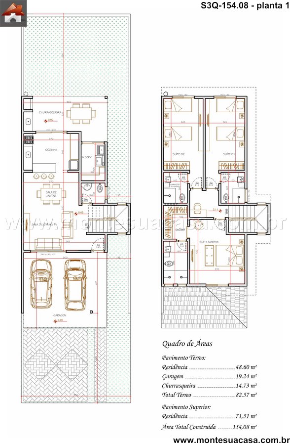 Este projeto de sobrado moderno com 154,08m² de área construída combina funcionalidade, estética contemporânea e conforto para famílias que valorizam espaços bem distribuídos. Com dois pavimentos, o layout foi cuidadosamente planejado para oferecer privacidade nas áreas íntimas e integração nas áreas sociais.