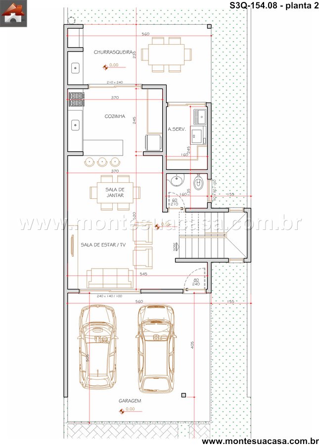 Distribuição inteligente dos ambientes No pavimento térreo, o destaque vai para a ampla sala de estar com TV, conectada à sala de jantar e à cozinha em conceito aberto. Essa configuração favorece a convivência e a ventilação cruzada. A área gourmet com churrasqueira está estrategicamente posicionada nos fundos, próxima à cozinha e ao espaço de serviço, facilitando o uso em ocasiões especiais. A garagem frontal comporta dois veículos lado a lado, com acesso direto à entrada principal.