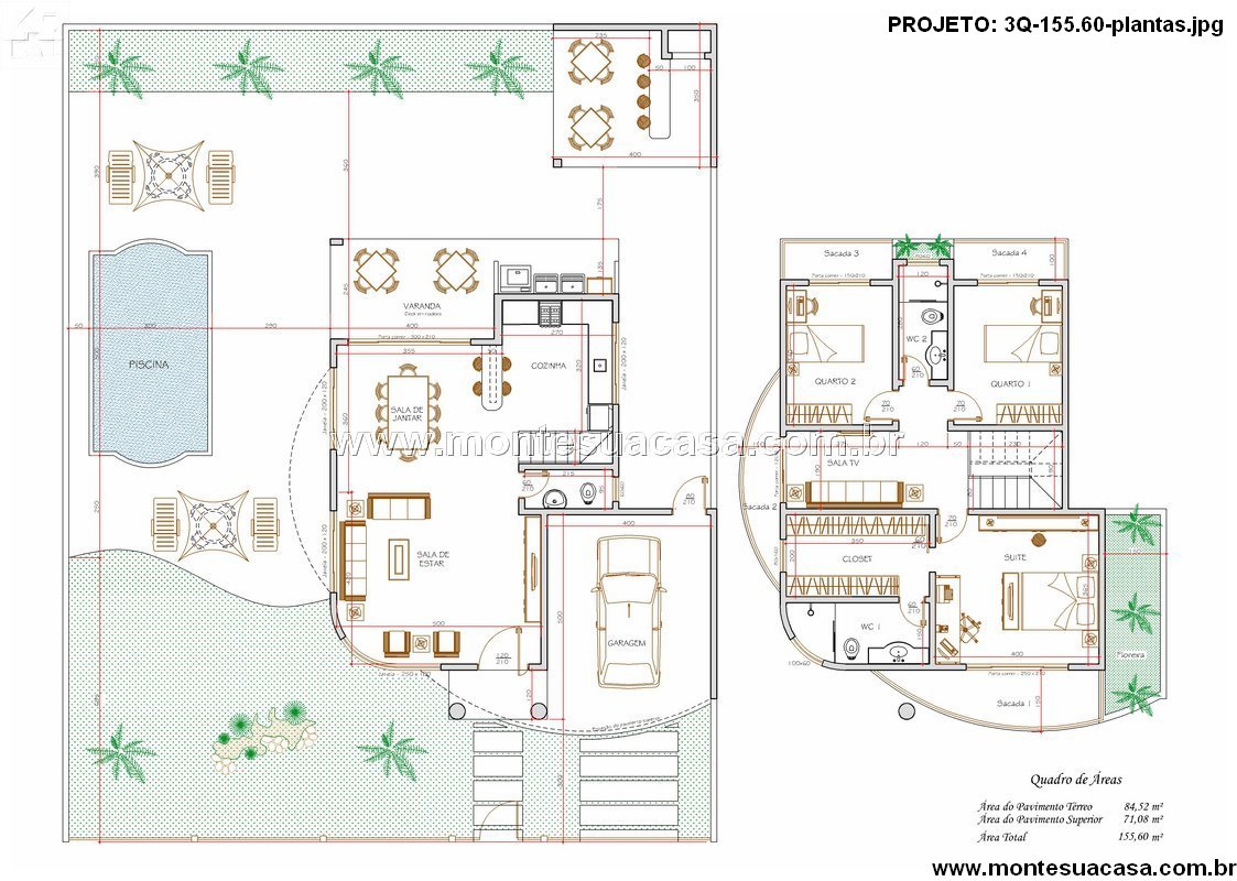 Com 84,52 m² no pavimento térreo e 71,08 m² no superior, o projeto aproveita cada metro quadrado de forma inteligente. As áreas sociais se abrem para o jardim e piscina, promovendo integração com a natureza, enquanto a área íntima oferece conforto e tranquilidade.