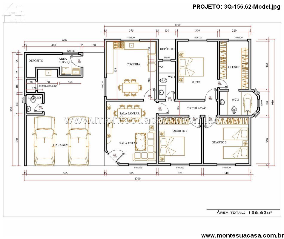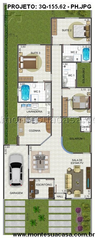 O projeto 3Q-155.62 apresenta uma casa térrea moderna, funcional e ideal para famílias que valorizam praticidade e conforto. Com 155,62m² de área construída, o layout foi cuidadosamente planejado para aproveitar ao máximo cada espaço, oferecendo ambientes amplos e integrados.