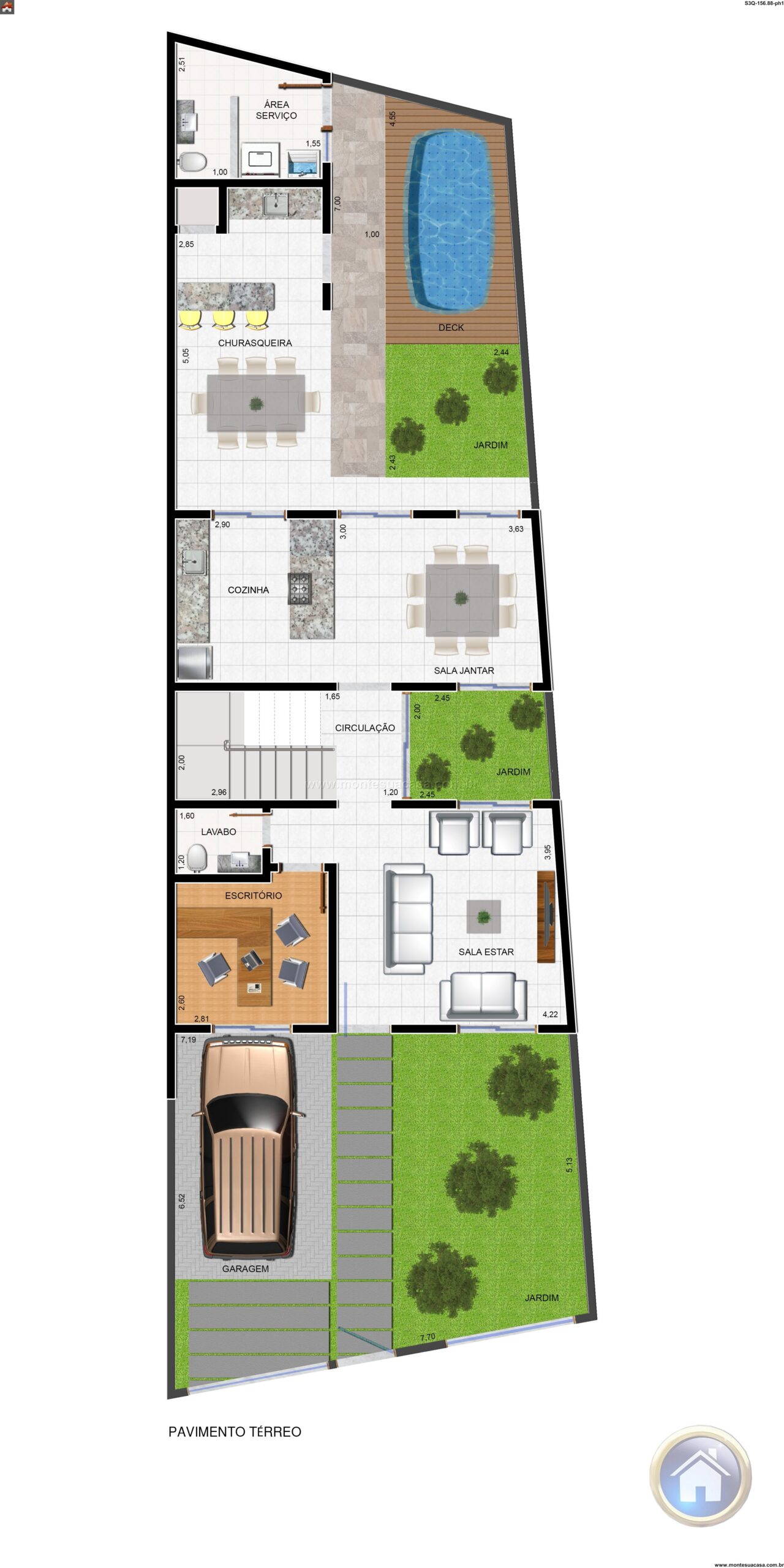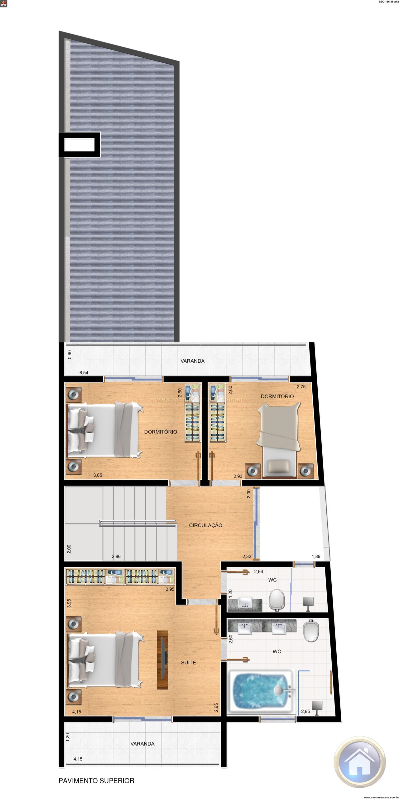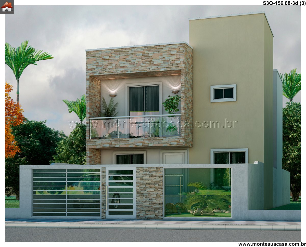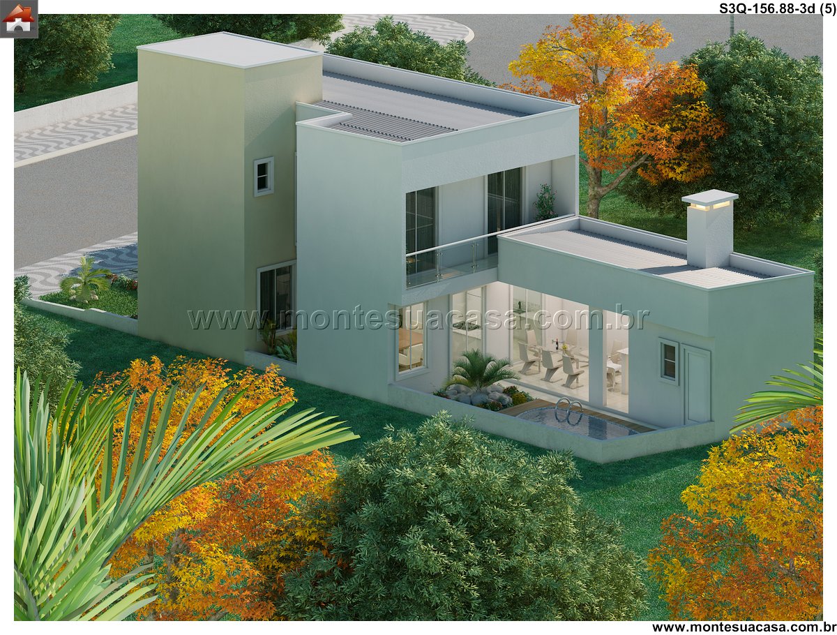 Este projeto de sobrado de 156,88m² oferece uma proposta arquitetônica moderna e funcional, ideal para famílias que buscam conforto, estilo e integração com a natureza. Com três quartos bem distribuídos, incluindo uma suíte com acesso à varanda envidraçada, o imóvel valoriza a iluminação natural e a ventilação cruzada em todos os ambientes.