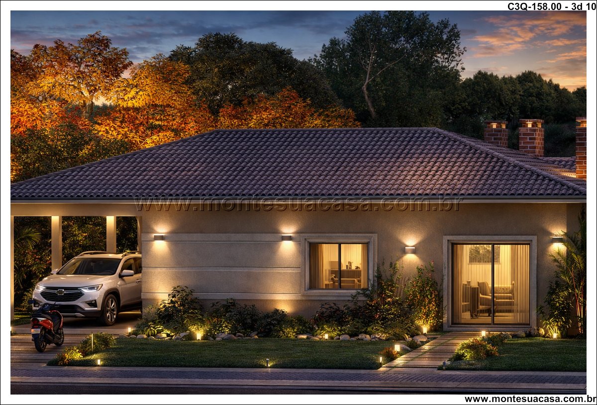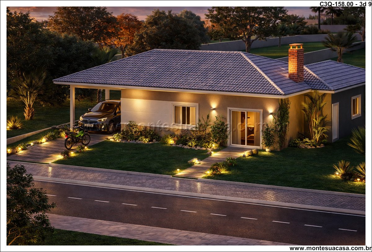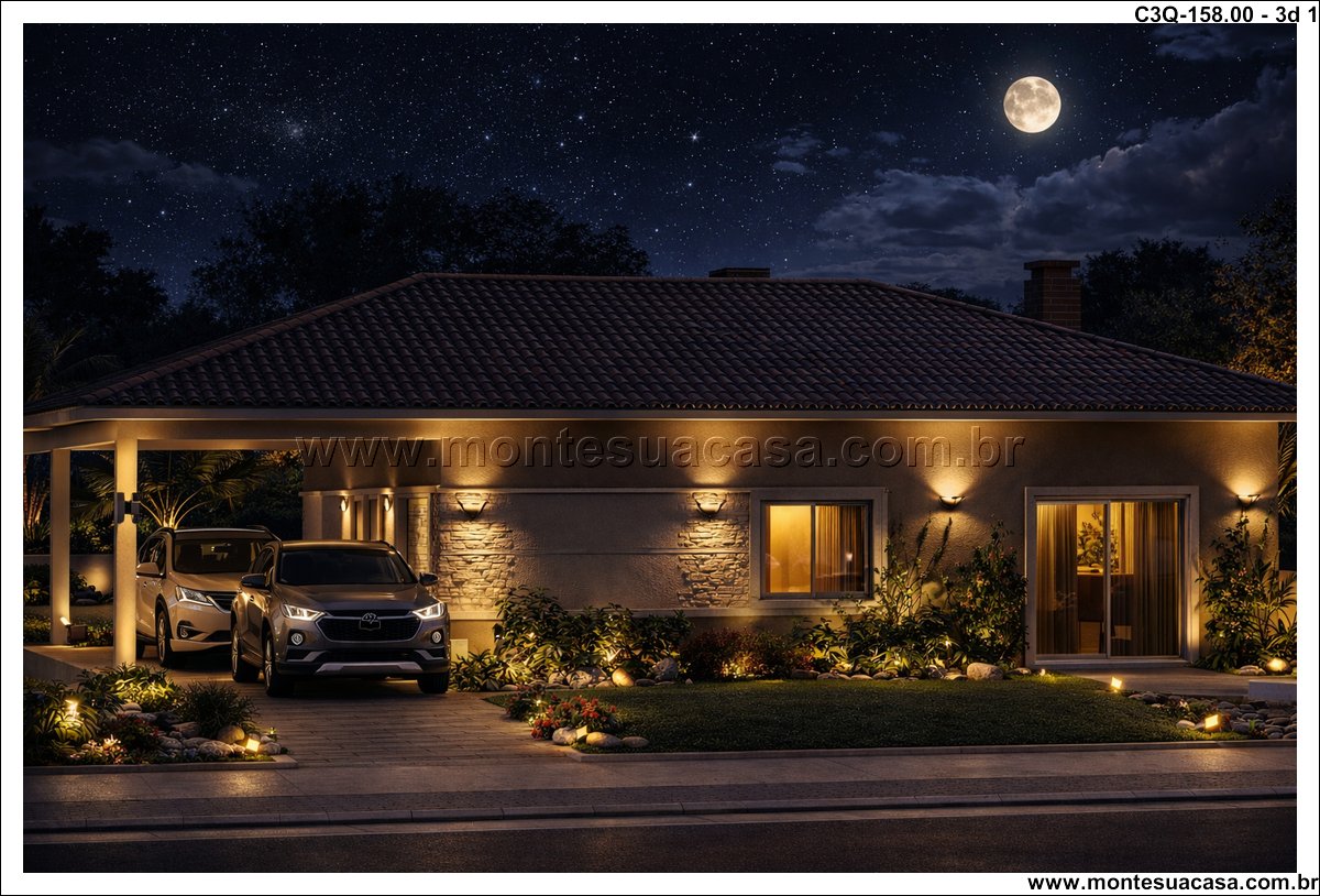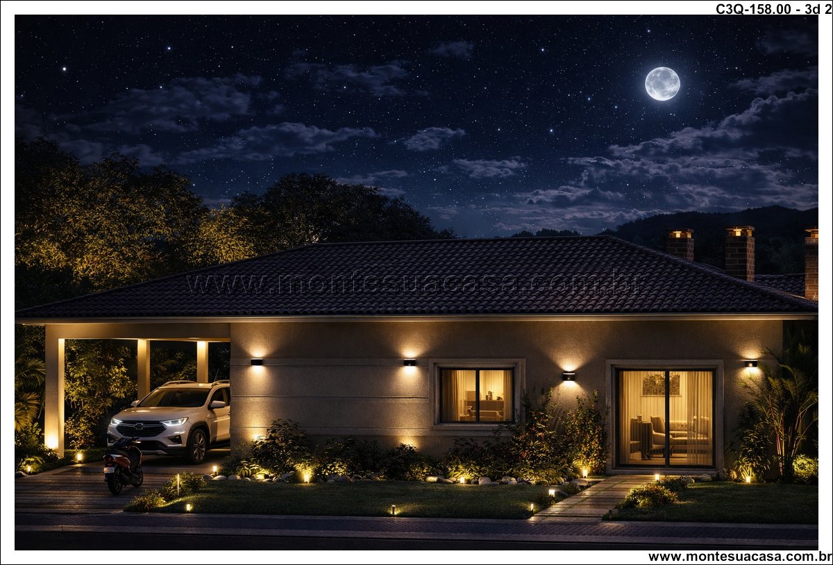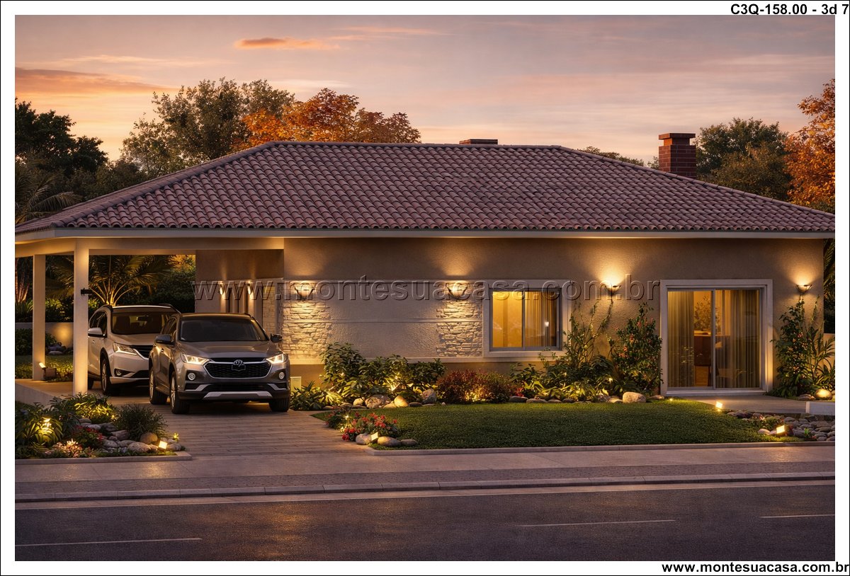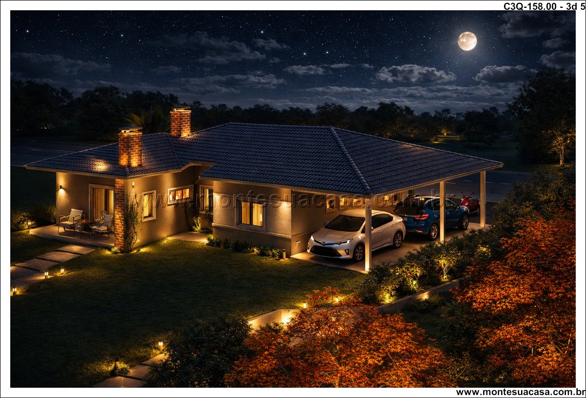 Este projeto de 158 m² apresenta uma casa térrea de 3 quartos desenvolvida para quem busca funcionalidade, conforto e um layout organizado. A planta combina ambientes amplos, circulação estratégica e uma fachada contemporânea com telhado aparente. A proposta atende famílias que desejam praticidade no dia a dia sem abrir mão de ambientes bem resolvidos e conectados ao exterior.