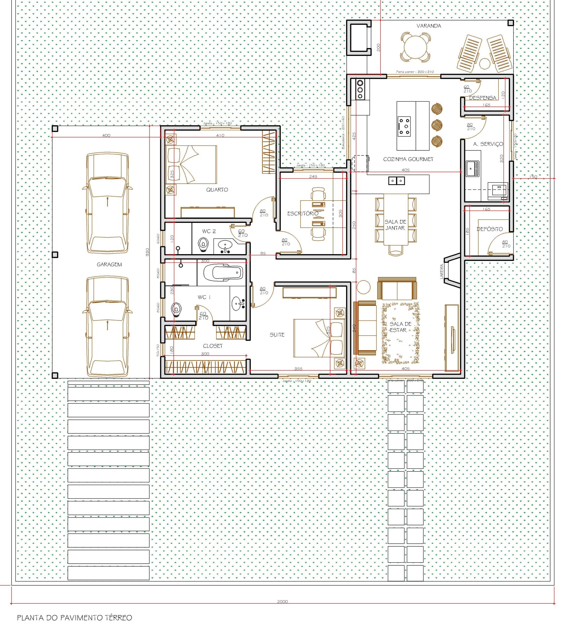 A garagem coberta para dois carros fica estrategicamente ao lado da entrada lateral, evitando exposição ao clima. A área de serviço possui acesso facilitado e ligação direta com a cozinha. A composição de aberturas, circulação e volumes garante ventilação eficaz e uso confortável em todos os ambientes.