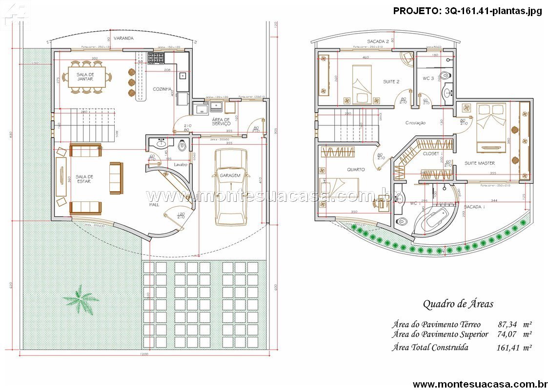 A área total construída é de 161,41 m², sendo 87,34 m² no pavimento térreo e 74,07 m² no pavimento superior. O projeto foi desenvolvido com foco na otimização dos espaços, iluminação natural e estética moderna, ideal para quem busca uma casa confortável e elegante.