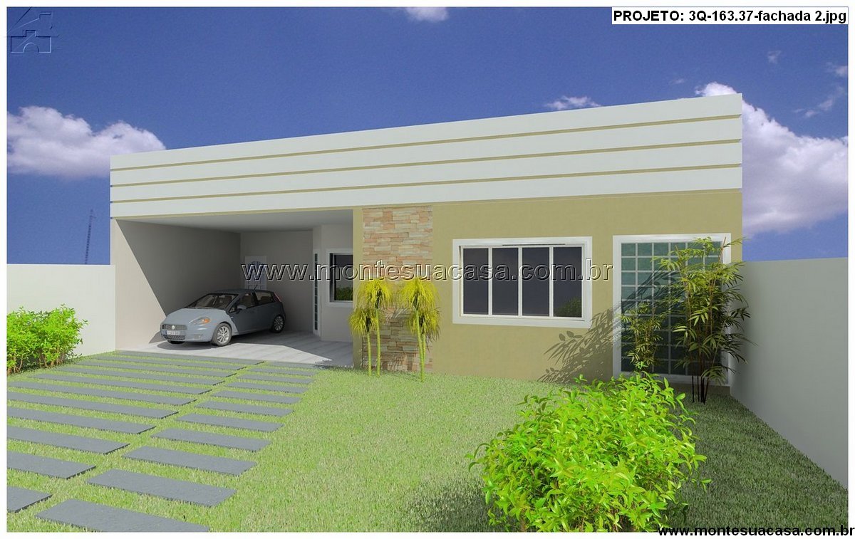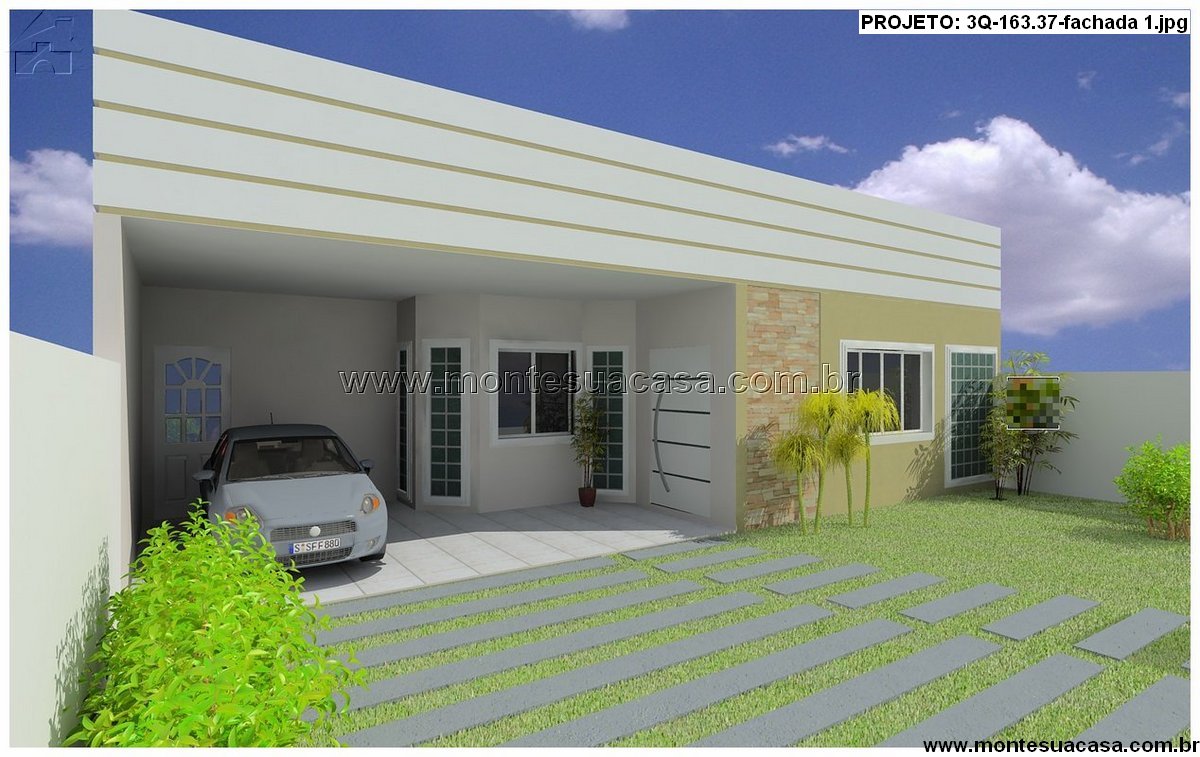 Este projeto de casa térrea com 163,37m² combina conforto, funcionalidade e elegância em um layout moderno e bem distribuído. Sua fachada apresenta linhas horizontais marcantes, revestimento em pedra natural e um belo contraste de cores neutras, que reforçam o estilo contemporâneo. O destaque fica para o design limpo e sofisticado, com garagem coberta para dois carros e jardim frontal integrado, valorizando o paisagismo e o apelo visual.